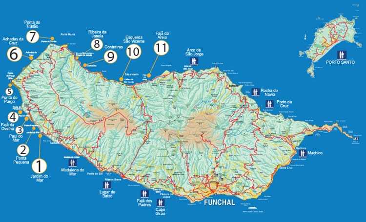 11 tuti szörfpont Madeirán: 1. Jardim do Mar: Észak-Kelet irányú szél | alacsony árapály | szint: középhaladó, haladó 2. Ponta Pequena: Észak-Kelet irányú szél | alacsony árapály | szint: középhaladó, haladó 3. Paul do Mar: Észak-Kelet irányú szél | magas árapály | szint: középhaladó, haladó 4. Fajã da Ovelha: Észak-Kelet irányú szél | alacsony árapály | szint: haladó 5. Ponta do Pargo: Észak-Kelet irányú szél | alacsony árapály | szint: középhaladó, haladó 6. Achadas da Cruz: Észak-Kelet irányú szél | közepes árapály| szint: haladó 7. Porta do Tristão: Észak, Észak-Nyugat irányú szél | alacsony árapály | szint: haladó 8. Ribeira da Janela: Észak, Észak-Nyugat irányú szél | alacsony árapály | szint: középhaladó, haladó 9. Contreiras: Dél, Dél-Nyugat irányú szél| alacsony árapály | szint: középhaladó, haladó 10.Esquerda de S. Vicente: Dél-Nyugat, Nyugat irányú szél | alacsony árapály | szint: középhaladó, haladó 11.Fajã da Areia: Dél-Nyugat, Nyugat, olykor Észak irányú szél | váltakozó árapály | szint: kezdő, középhaladó, haladó brochura 29 x 21cm curvas Forrás: Surftoday