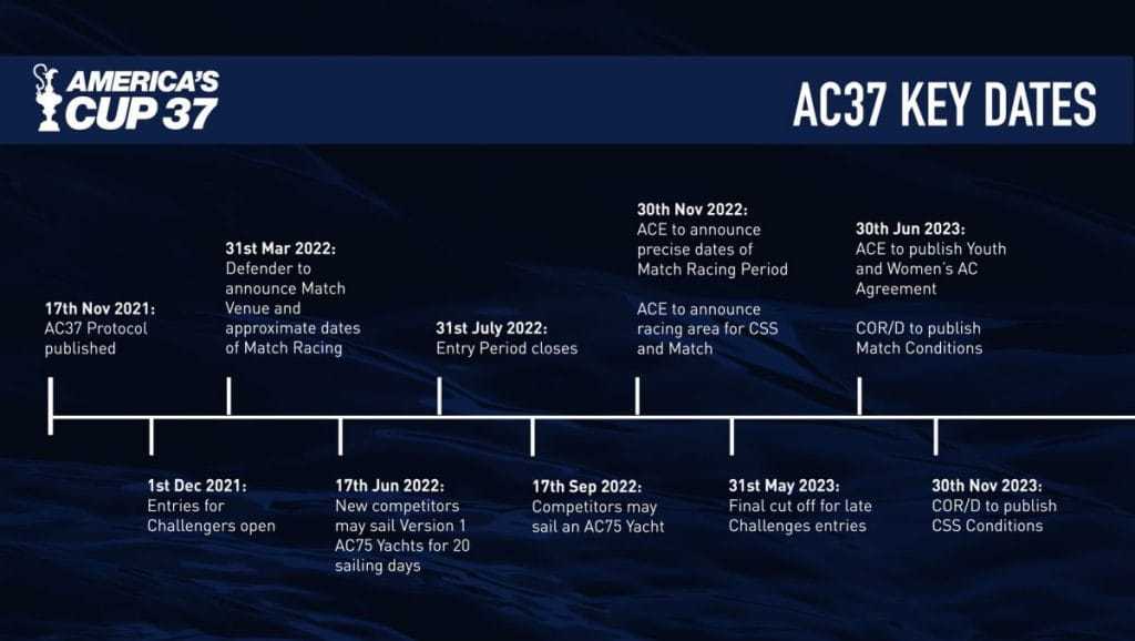 – hajók a 38. America’s Cupra: minden, a 37. AC-n induló csapatnak nyilatkozatot kell aláírnia, hogy győzelme esetén a következő Kupára megtartja az AC75-ösöket