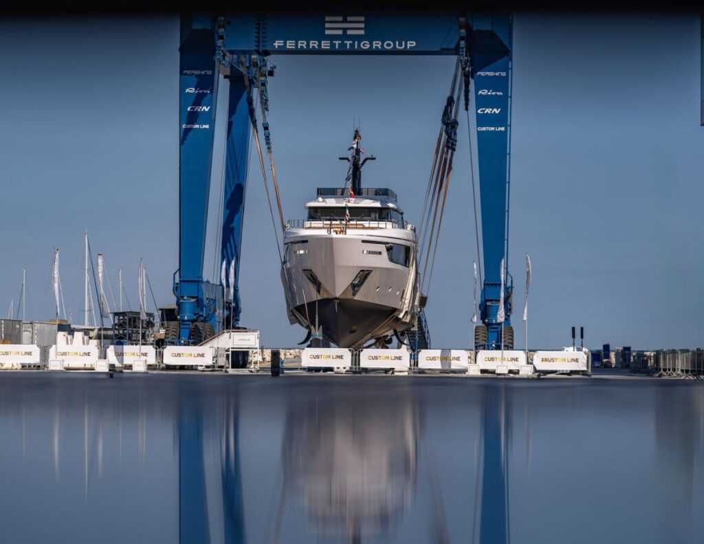 Június 19-én a siklótestű Custom Line 106′ huszonkettedik példányát úsztatták ki. A 32,82 méteres jacht ügyesen ötvözi az olasz esztétikát és kényelmet elegáns belsőépítészeti elemekkel és olyan anyagokkal, mint a Nero Marquinia márvány vagy az amerikai dió.