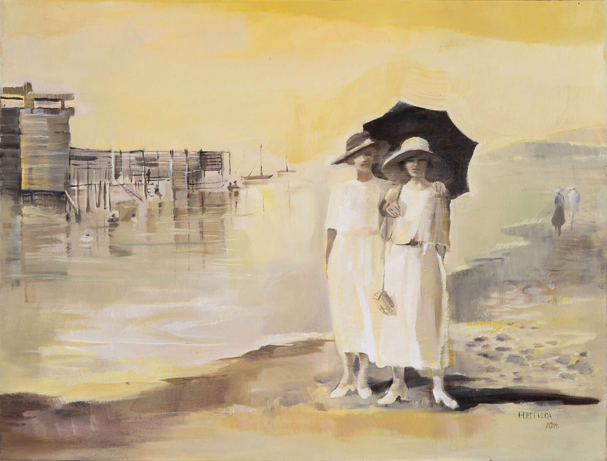 Aztán ott vannak a kollázsai, amelyek régi fotókból, textilekből, merített és öntött papírokból állnak össze képpé. Ezek is a Balatont tükrözik. Fekti Vera évtizedek óta gyűjti a magyar tengerről szóló kiadványokat, a régi fürdőházakról vagy nagyanyáink fürdődivatjáról készült fotográfiákat. Ihletének kimeríthetetlen forrása a szülői örökségből vásárolt présház Balatonalmádiban, az Öreghegyen, a ház alatt elterülő mély völgy és a káptalani dombról elé táruló látvány.