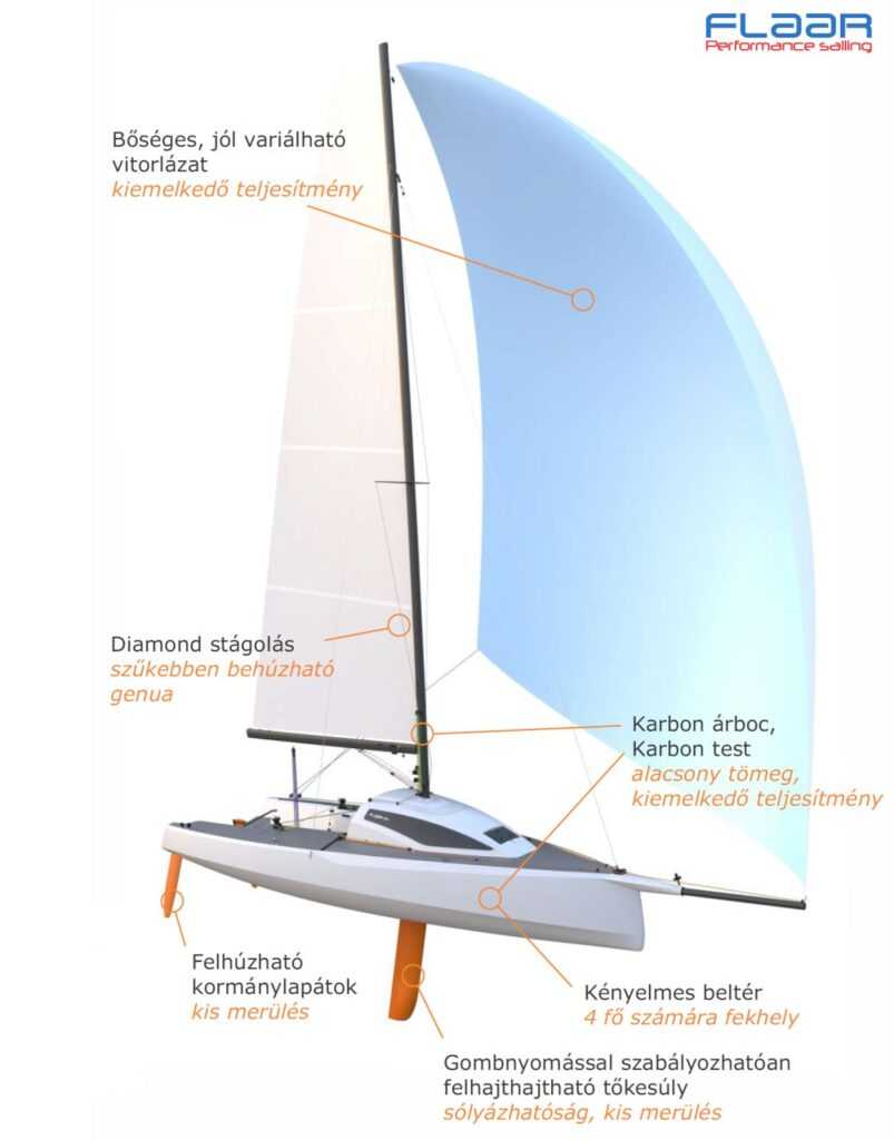 Sikerült olyan hajót tervezni, ami egyesíti a piacon található hajók előnyeit. Könnyű, biztonságos, belül tágas, megfelelő menetteljesítményekkel rendelkezik egyszerű kezelhetőség mellett. A kis ellenállású testnek köszönhetően kimondottan alkalmas gyenge szeles tavi körülményekre, de erős szélben is kellő stabilitással rendelkezik, biztonságos, így akár kevés tapasztalattal is használható. Sőt, masszív szerkezete miatt akár oktatásra is alkalmas. A hajó különlegessége, hogy a tőkesúly mindenféle külső eszköz (daru, emelőkeret) nélkül felhúzható, ráadásul ehhez nem emberi erő szükséges, hanem egy elektromos aktuátor elvégzi a munkát. Így sekély/hínáros vízben is lehet vele hajózni (nincs bulba), és könnyű sólyázhatósága miatt mobilis: könnyen szállítható, és akár parton tartható, nem szükséges számára kikötőhely. A beltere 4 fő számára kényelmes fekhelyet biztosít, és így teljesen alkalmas túrázásra is. Ehhez nagy segítség lehet a rugalmas motorizálhatóság: beépített elektromos motorral vagy külmotorral szerelhető.
