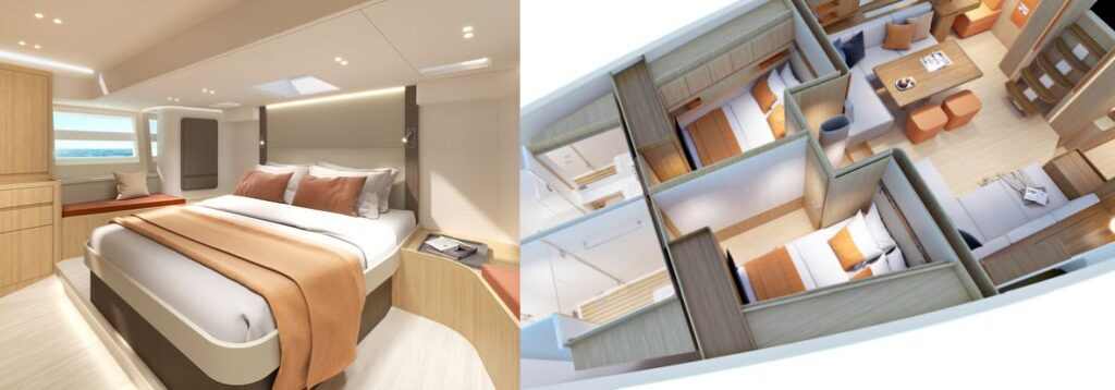 Három vagy négy kétágyas kabinnal kérhető – hátul kap helyet a tulajdonosi lakosztály, míg a két vagy három vendégkabin az orrban