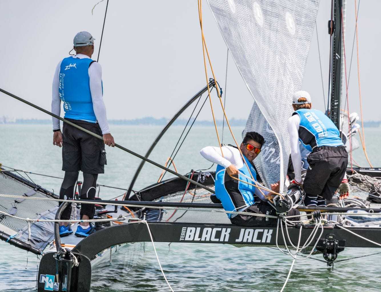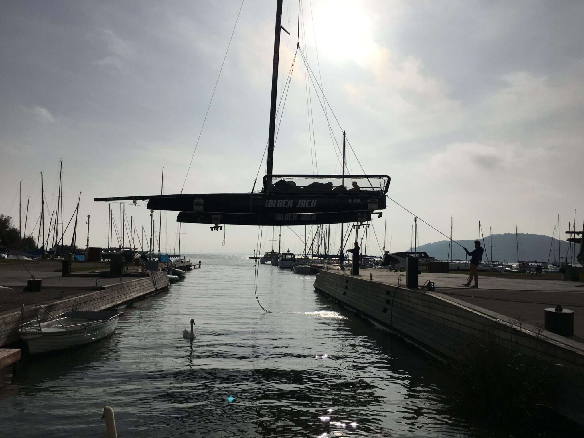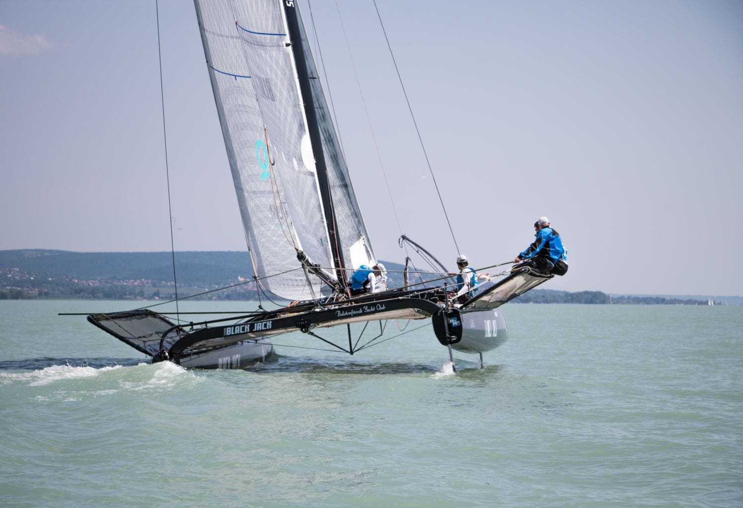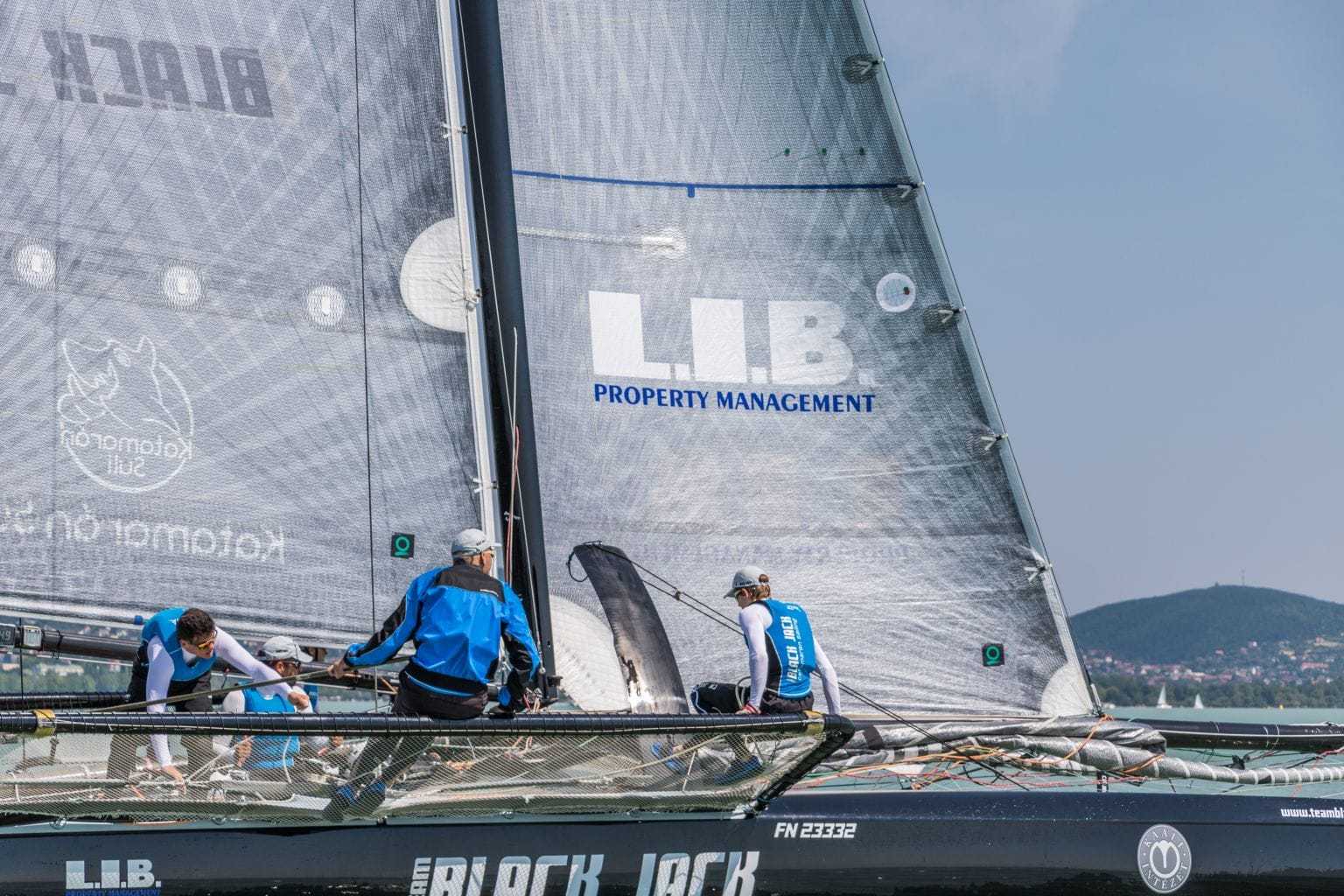 Black_Jack_elpakolás Mihálkovics Tivadar-emlékversenyen az első nap sokat hibáztunk, nem voltunk ritmusban a fedélzeten, így a futamot megnyerő GC32 után, valamint két negyvenlábas katamaránt követően futottunk csak át a negyedik helyen. Vasárnapra megráztuk magunkat, és második helyen futottunk be. A Fehér Szalag GeneralCom Nagydíj, 19. Izsák Szabolcs-emlékverseny az idén erős szeles körülmények között zajlott, amelyen a negyedik helyen végeztünk.