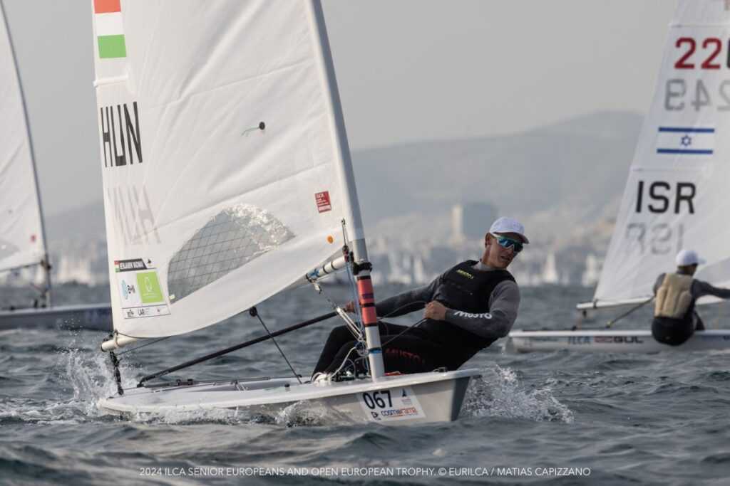 – Az volt a cél, hogy a dobogó közelében végezzek, de a kezdet nehéz volt, sőt, inkább semmilyen, hiszen az első két nap nem sikerült futamot rendezni. A folytatásban is nagyon nehéz, trükkös körülmények között, mondhatjuk, hogy pocsék szélben versenyeztünk. Ráadásul peches is voltam, többször előfordult, hogy elfordult a szél, vagy az addigi tendenciával ellentétben a másik oldalon frissült, így elment jó néhány hajó. A legdurvább esetekben tízen is kikerültek. Ez pedig rengeteget számított, a hullámvasút nagyon lefelé indult… Egy futam kiejthető, de azt nem a verseny elején kellett volna hoznom. Akkor úgy nézett ki, hogy néhány jó eredményre van szükségem a döntő futamokon, és akkor még akármi lehet. Azonban a szélviszonyok nem sok lehetőséget biztosítottak, fogyott az idő, az utolsó nap előtt összesen öt kvalifikációs futamunk volt, így nem lehetett éremfutamot rendezni, hanem további három döntő futamra került sor. Szerencsére, mert akkor nem kerültem volna be az első tízbe, az éremfutam résztvevői közé. Tizenkettedik helyen álltam az utolsó nap előtt, ami viszont jól, de közel sem tökéletesen sikerült. 8–12 csomós szél fújt, amit igazán szeretek, és elkaptam a fonalat. Ebben a szélben van egy kis extra sebességem, ami apró hajóvezetési trükkökből adódik. Az utolsó nap az első futamot megnyertem. A másodikban negyedik helyen mentem a part felé, a pozíciómat biztosítandó még be is igazítottam, majd elindultam balra, de a szél egyre inkább a túloldalnak kedvezett, ott frissült és egyetlen balos lengés sem volt benne. Nem tudtam mit tenni, nézhettem, ahogy sokan elmennek. Bőszélben megfogtam pár hajót, és a 14. helyen futottam be, ami úgy tűnt, hogy nem fér bele. Vészesen fogyott az idő, féltem, hogy el sem indítják a harmadik futamot, ezzel vége az Eb-nek és az éremesélyeimnek is. Ha sikerül megtartanom a negyediket, akkor én vezettem volna az összetettben, ami elég lett volna az aranyéremhez… Végül lement az harmadik futam, amit sikerült megnyernem, ezzel összetettben a második helyen végeztem. Ez – és a genovai világkupa győzelmem – életem legjobb eredménye. Nagyon örülök, hogy Benjivel mindketten a pódiumon állhattunk az eredményhirdetésen. Nagyon megható pillanat volt, korábban ilyen csak a juniorok között fordult elő.