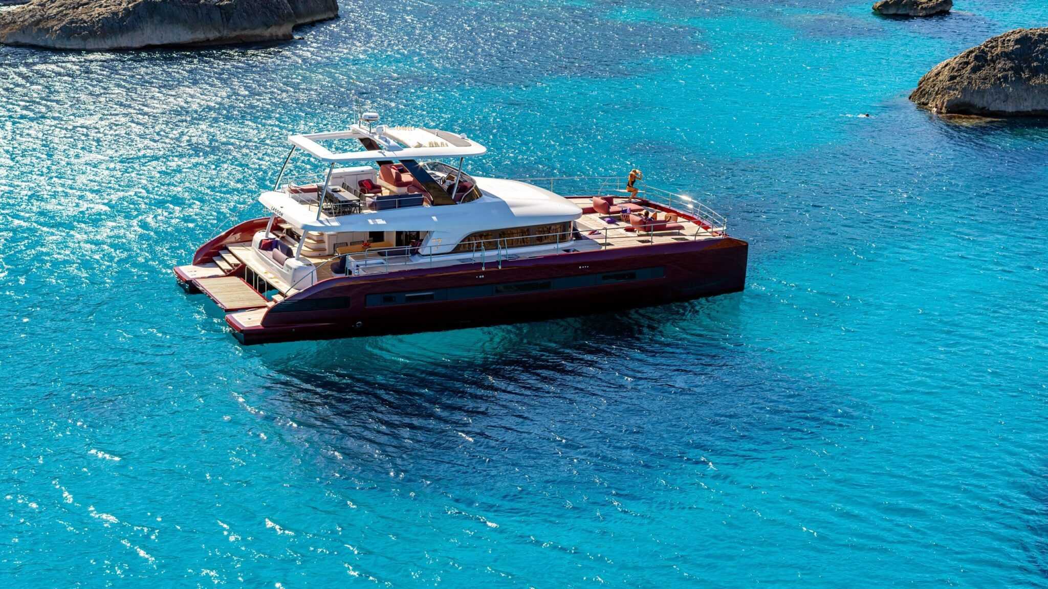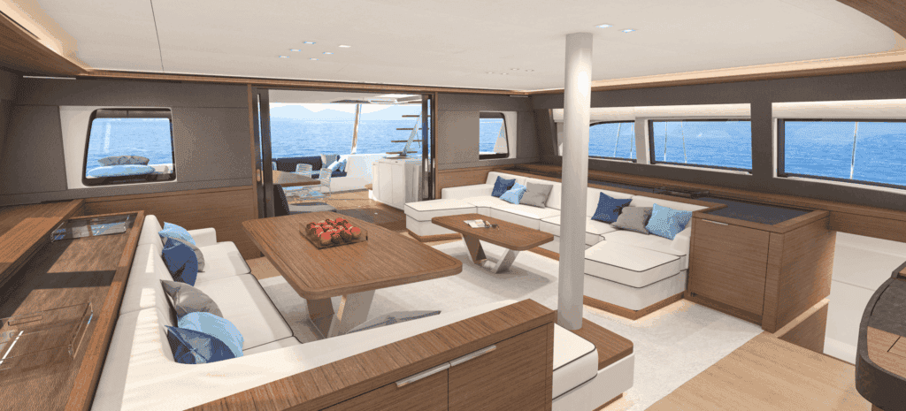 Ahogyan azt elvárhatjuk egy ekkora katamarántól, a belmagasság tágas térérzetet biztosít. A kabinokat és a nappalit is elárasztja a természetes fény. A nappali 360 fokos körpanorámáját alig töri meg valami.