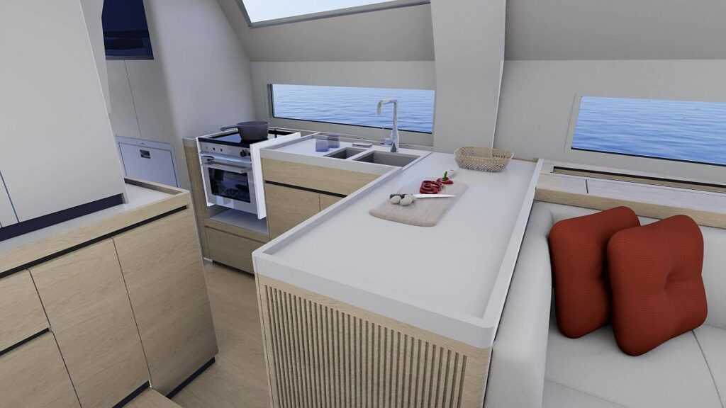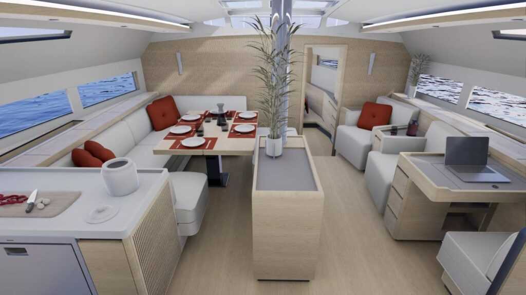 Az opciós lista hosszú: három rudazat, két tőkesúly és két különböző belső kialakítás. A karbon árbóchoz baumba tekerhető nagyvitorla tartozik, a JP3-as rendszer pedig kellően érzékennyé teszi kormányt. A fedélzeti elrendezés rengeteg pihenőhelyet biztosít, bőséges a tárolási kapacitás, nagyok a tartályok, igaz, nincs külön dingi garázs.