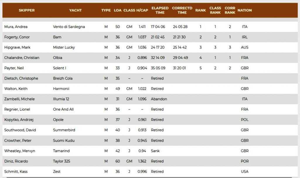 Hét hajó maradt versenyben – a Vento di Sardegna, a Bam, a Mister Lucky, az Olbia és a Solent 1 az OSTAR-on, a Rote 66 és a Midnight Summer Dream a TWOSTAR-on. A célhoz közeledve a Vento di Sardegna tőkesúlyát mozgató hidraulikus rendszer felmondta a szolgálatot, Andrea Mura kénytelen volt megállni Új-Skócia közelében, hogy megjavítsa. De még így is diadalmaskodott, június 15-én 12.06-kor ő szelte át először a newporti célvonalat. Futott ideje 17 nap, 4 óra, 6 perc, ami az előnyszámával korrigálva 24 nap, 5 óra, 28 perc, 50 másodperc (7 perccel jobb, mint a négy évvel korábbi). Második lett Conor Fogerty (Bam), harmadik Mark Hipgrave (Mister Lucky). A két további teljesítő: a harmadik OSTAR-ján induló Christian Chalandre (Olbia) és Neil Payter (Solent 1).