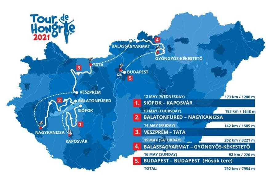 A Tour de Hongrie május 12-én Siófokon rajtol, az útja során hét megyét (Somogy, Veszprém, Zala, Győr-Moson-Sopron, Komárom-Esztergom, Nógrád és Heves), illetve tizennyolc várost (köztük két megyeszékhelyt, Kaposvárt és Veszprémet, valamint a fővárost, Budapestet), összesen 113 települést érint.
