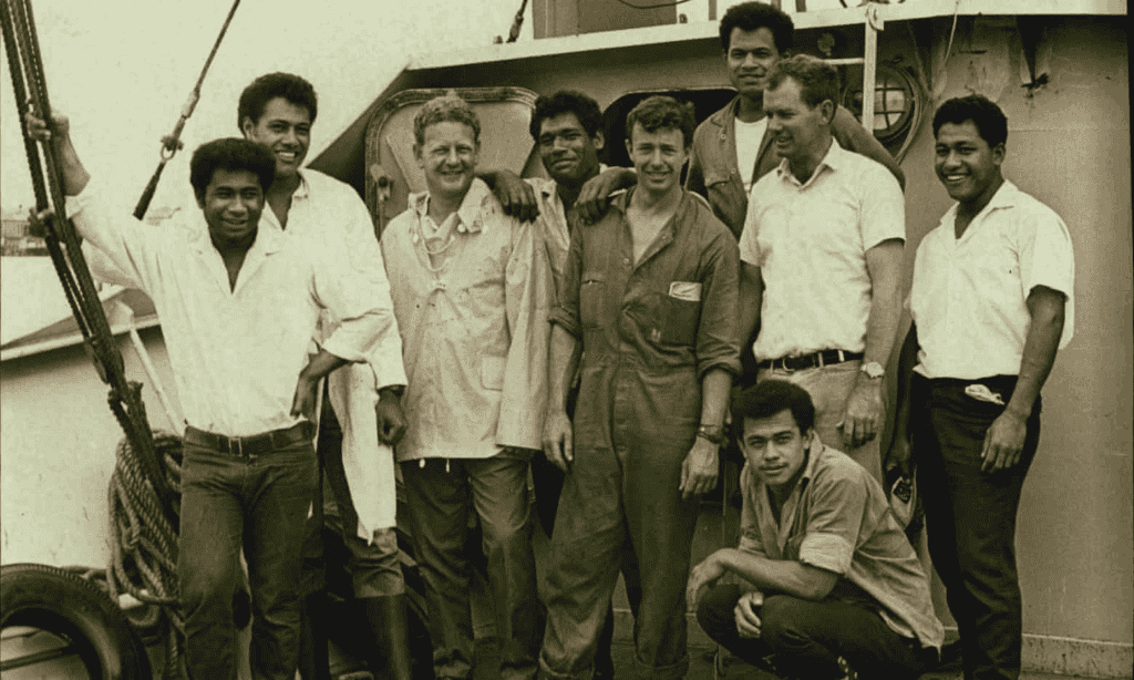 A szigeten korábbi tüzek nyomai látszottak, ami a trópusokon meglehetősen szokatlan. Ahogy partközelbe ért, egy meztelen, hosszú hajú gyerek ugrott a vízbe és elkezdett a hajó felé úszni, majd hamarosan többen követték. „A nevem Stephen és kb. 15 hónapja vagyunk itt” – mondta a fiú tökéletes angolsággal, ahogyan a hajóhoz ért – emlékszik vissza Peter Warner közel 60 év távlatából.