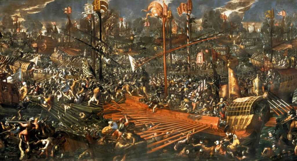 A Szent Liga hajóhada és a Müezzinzade Ali pasa által irányított török flotta 1571. október 7-én vívta a lepantói tengeri csatát, amelyben a keresztények világraszóló győzelmet arattak az oszmánok felett.