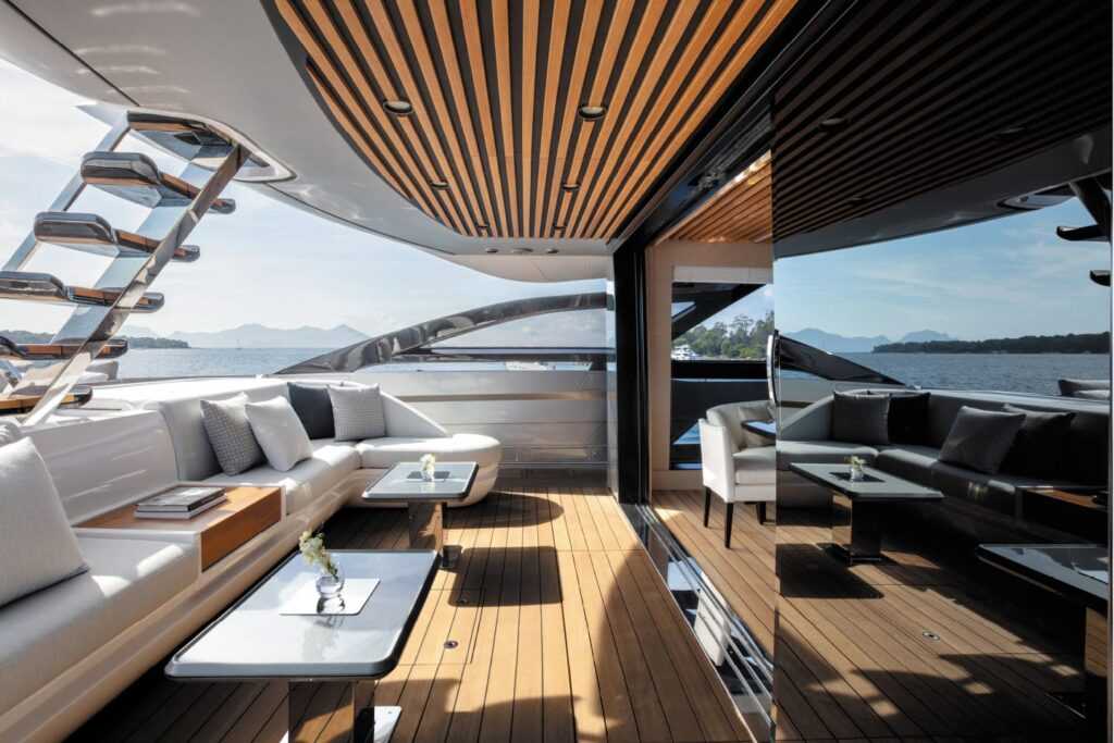 A kétzónás hátsó fedélzet elrendezése különösen érdekes. A tat kissé megemelkedik és nyitott a napozáshoz, vagy akár az esti tánchoz, miközben a hátsó fedélzeti ajtók által elzárható két külön belső zóna védve van. A tat előtti teret a flybridge árnyékolja, ahová elegáns külső lépcsőn lehet feljutni.