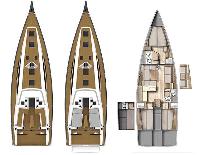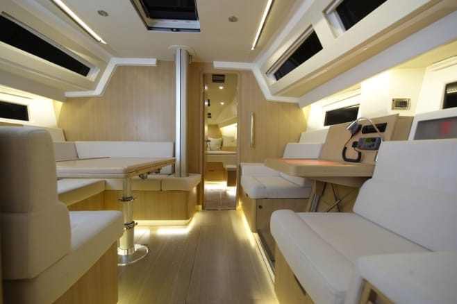 Amikor elkezdünk körbesétálni, mindenhol a kezünk ügyébe esik egy-egy fogódzó: kapaszkodó a plafonon, fül a térelválasztó falon, mélyedés az asztal sarkában. A jelentős szélességgel okosan gazdálkodott a tervező, úgy helyezte el a bútorokat, hogy kényelmesen átjárható, de nem túl tágas, és ezáltal nyílt tengeri úton veszélyessé váló terek alakultak közöttük. Három kabin, két fürdő, mindenhol elég tároló, de a két hátsó lakrész légtere az átlagosnál kissé szűkebb a kokpit padló rekesze miatt.