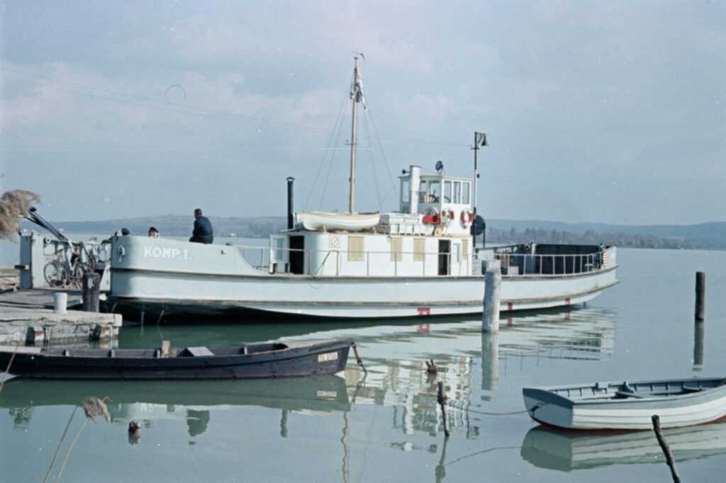 A gőzhajtású vaskomp óriási előrelépést jelentettek a korábbi evezős átkelőhajókkal szemben, hiszen ezt megelőzően az autók és szekerek tulajdonosainak maguknak kellett gondoskodni arról, hogy a jármű valamilyen pallón feljusson az evezős kompra. Az új kikötők építésével viszont már az alacsony vízszint sem akadályozta a járművek gördülékenyen felhajtását. A Ganz-Danubius hajógyár által jegyzett motoros komp 60 utast és 8-10 szekeret, vagy gépkocsit tudott szállítani. Az átkelési ideje 12 percig tartott és a tó befagyásáig menetrendszerűen közlekedett. Tartalékban – üzemzavar esetére – egy fakompot is tartottak, amely 4 szekeret vagy autót tudott a hátára venni és evezővel, illetve egy segédmotorral hajtották. Erre szükség is volt a vaskomp gyakori meghibásodása miatt.
