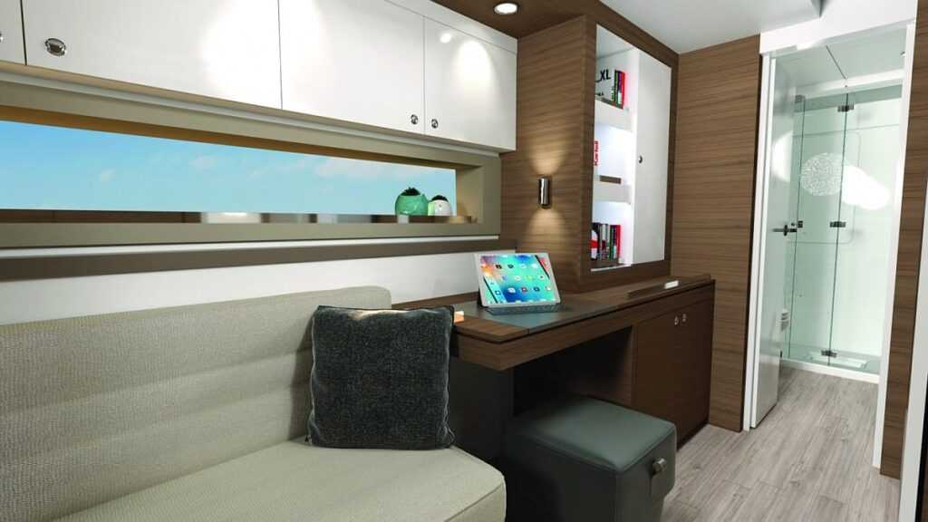 Szkipper kabinból csak egy kérhető, ezt jobbra építik be, a bal oldali rekesz tároló vagy fürdő lehet.