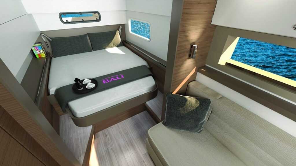 A Bali 4.2 rendelhető szimmetrikus és aszimmetrikus kivitelben: előbbi a négykabinos (és négyfürdős) megoldás, míg utóbbi a tulajdonosi verzió, amiben a jobb oldali testben kettő, míg a bal oldaliban egy tágas és szellős kabin kap helyet. Ekkor a bal oldali rész a tulajdonosi szekció, elegáns kanapéval, pipere/dolgozó asztallal és akkora fürdővel, amekkora csak elfér elöl.