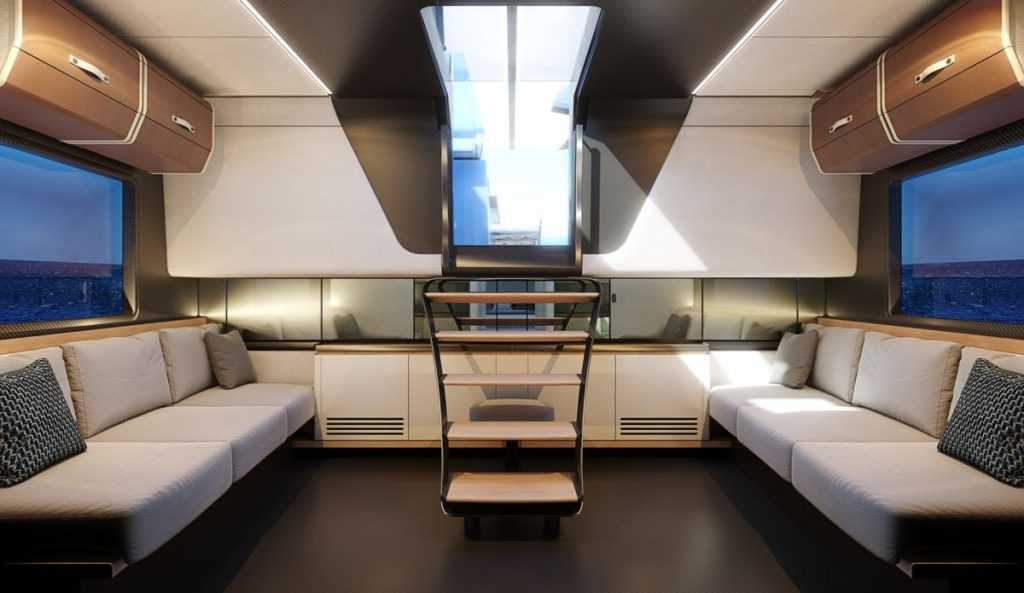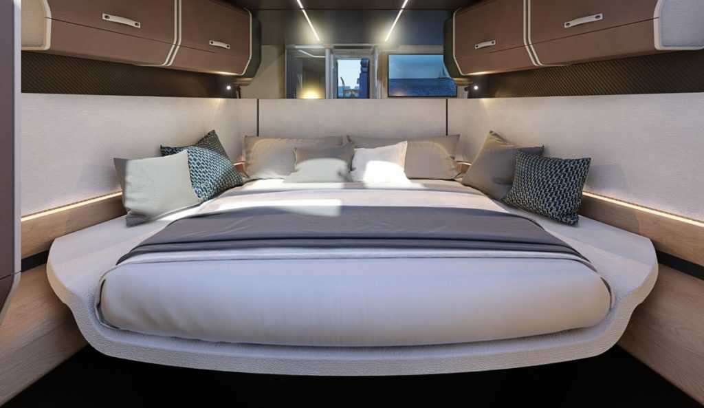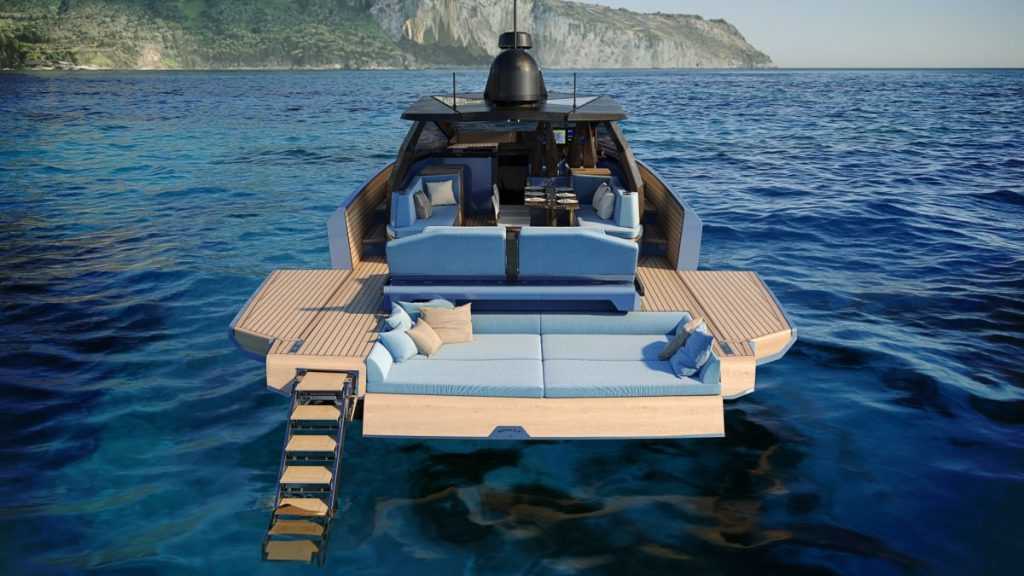 A kokpit a különböző éghajlati viszonyokhoz igazítható, az állítható hátsó fedélzeti napozópad többféle pihenési lehetőséget kínál akár négy felnőtt számára. Az összecsukható „szárnyak” a hátsó fedélzeten tovább növelik az egyébként sem kicsi fürdőplatformot, amely könnyű hozzáférést biztosít a vízhez, illetve a kismotoros és a vízi játékok tárolója lehet.