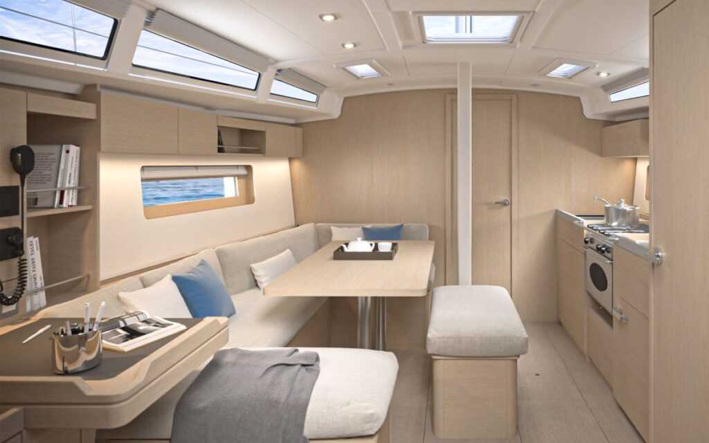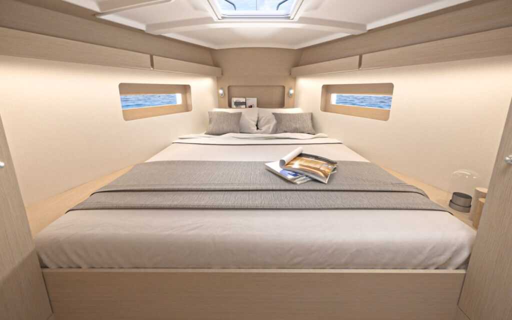 A Beneteau a 37.1-essel kezdve a fedélzet alatti belső térben diófa furnért használ, amelynek sötét színe jó párost alkot, az oldal- és mennyezetpanelek sok világos felületével. Ez vizuális mélységet és kellemes, otthonos lakókörnyezetet teremt, de persze a világosabb színárnyalatú fafajták továbbra is választhatók. Az alapértelmezésben kétkabinos hajóban a kétszemélyes fekhelyek téglalap alakúak, kétméteres hosszukhoz 1,80 méteres szélesség párosul, ami olyan kényelmi szintet jelent, amelyet ebben az osztályban nem sokan tudnak nyújtani. A kétkabinos jacht esetén a jobb oldali hátsó rekesz hatalmas – a kokpitból és belülről is elérhető – tárolóként áll rendelkezésre.