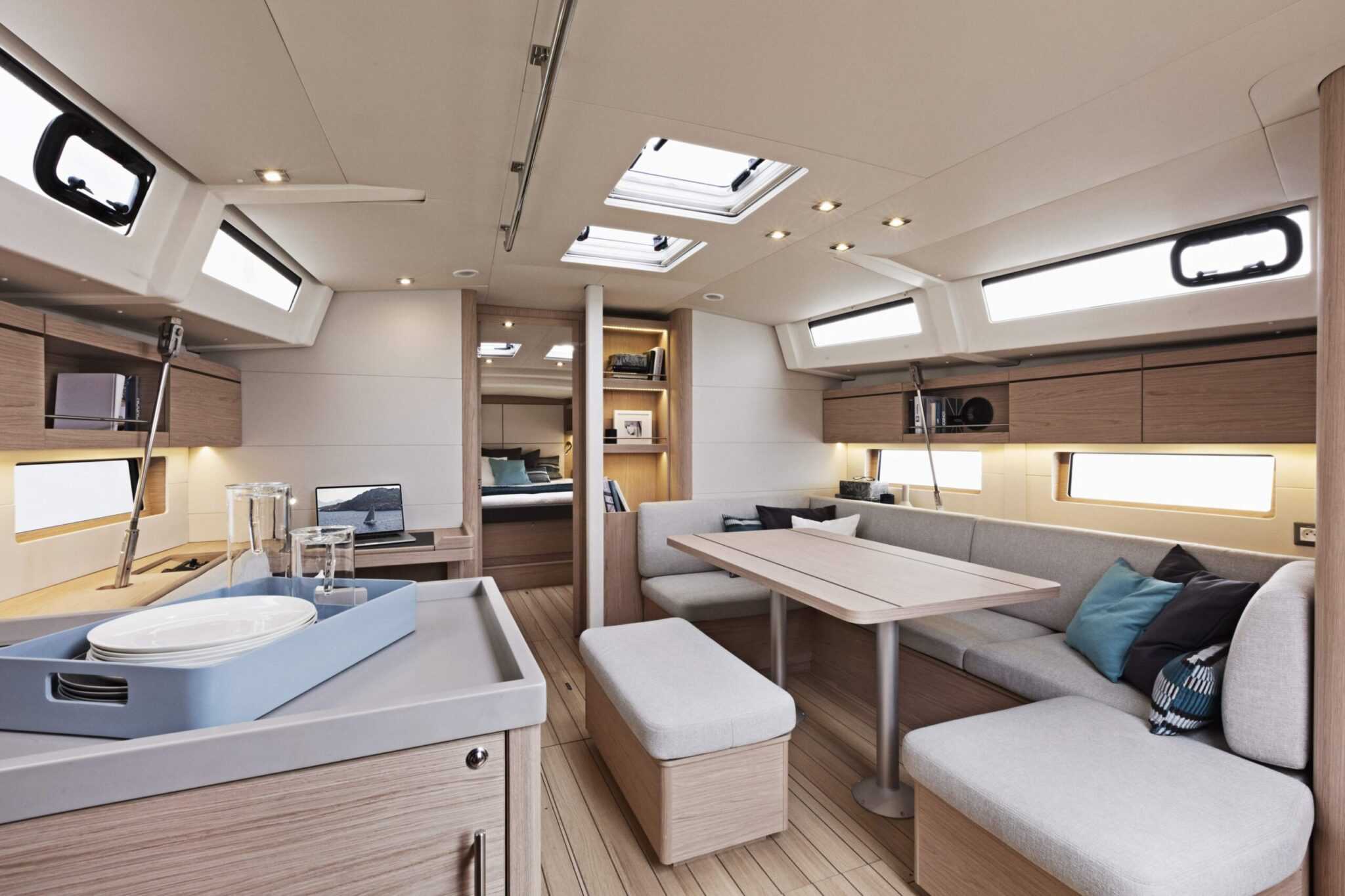 A nagy hajóablakok rengeteg természetes fényt engednek be, ezzel eleganciát kölcsönözve a jacht belsejének, amelyből lélegzetelállító kilátás nyílik a horizontra. A beltéri szekrények anyagát tekintve pedig választhatunk a fényes tölgyfa és a mahagóni közül. Az általában jóval nagyobb jachtokon található tulajdonosi kabint külön zuhanyzóval és két oldalról elérhető hatalmas dupla ággyal szerelték fel. A háromkabinos verzióban a vendéglakrészek ugyanakkorák és világosak, köszönhetően a nagy hajóablakoknak és a két fedélzeti ablaknak, a hajó belmagassága pedig lehetővé teszi a menetiránnyal megegyező fejtámlás ágyak elhelyezését is.