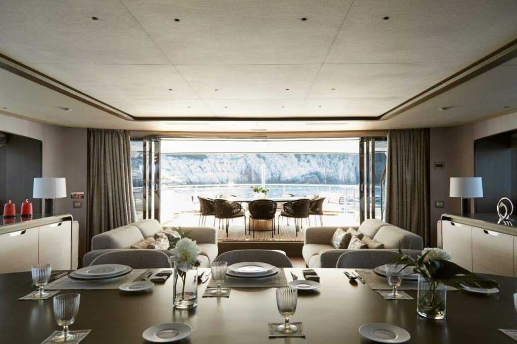 A hajó középső részét a nagy nappali tölti meg egy méretes étkezővel kombinálva, amit a szalon köt össze a hátsó dekkel, ahol további asztalok és kanapék várják a pihenni vágyókat.