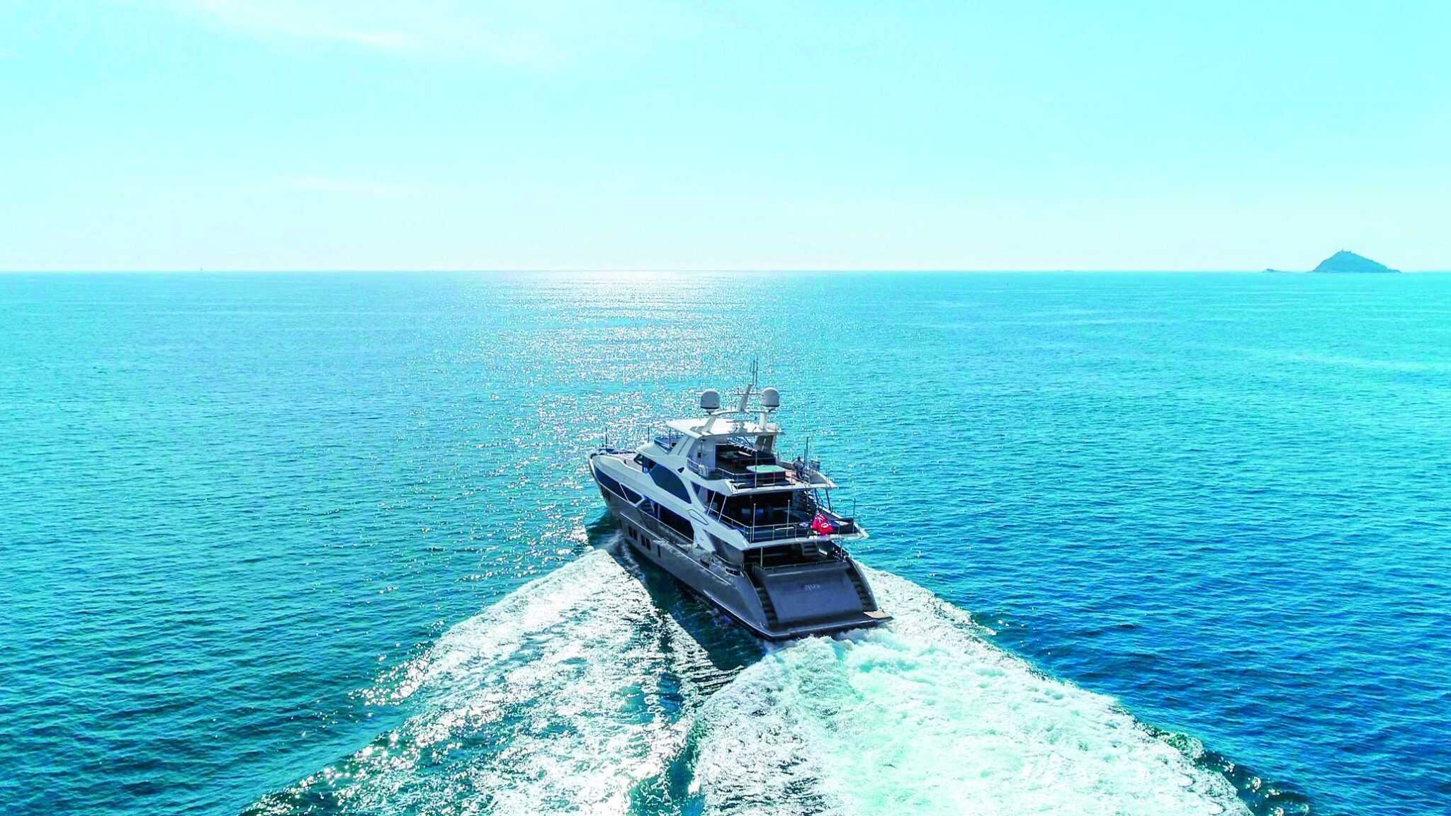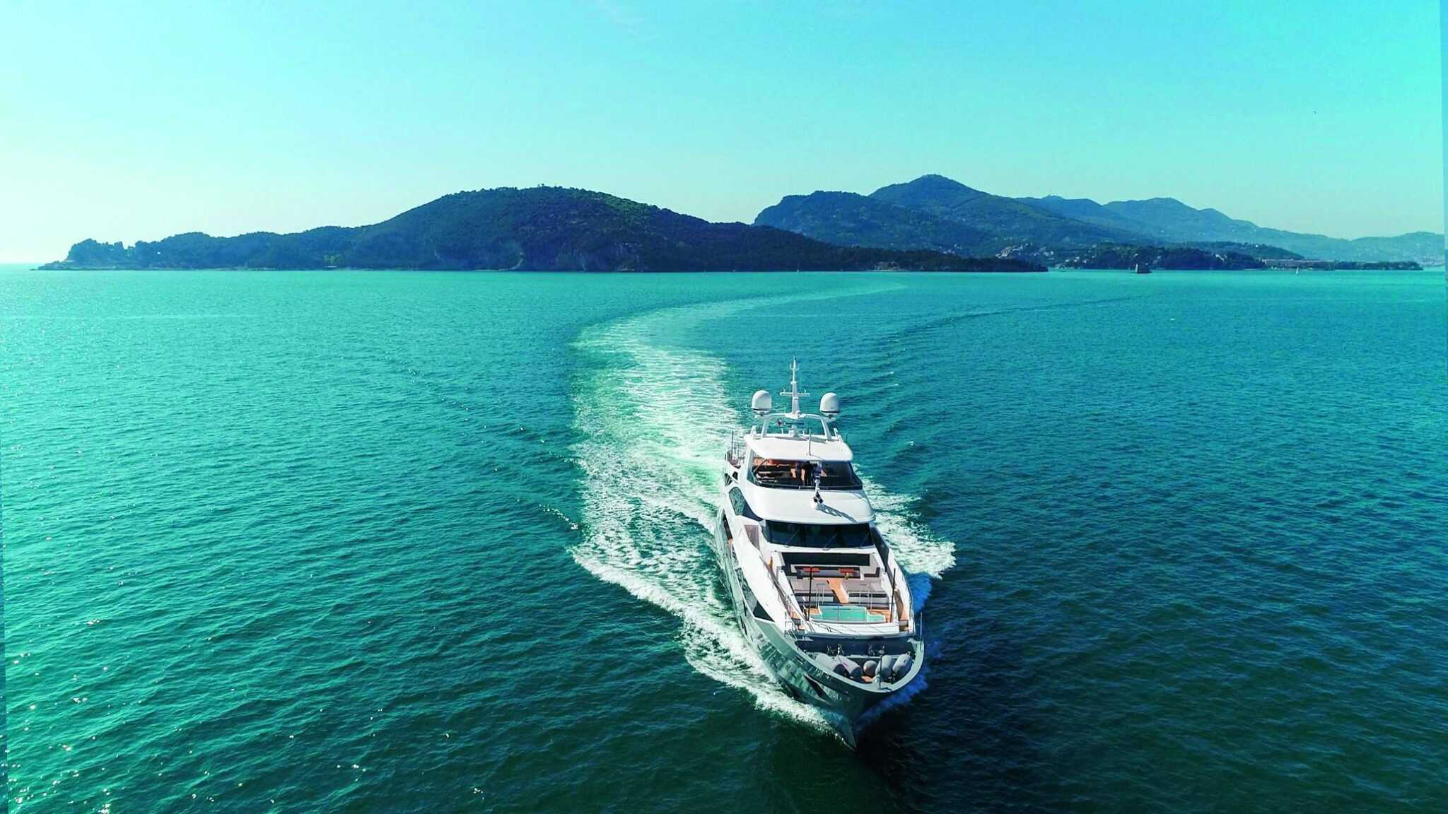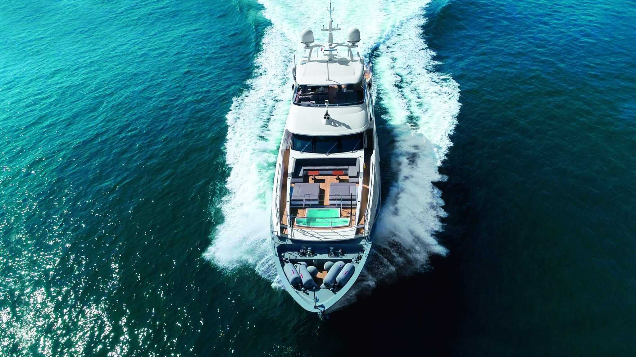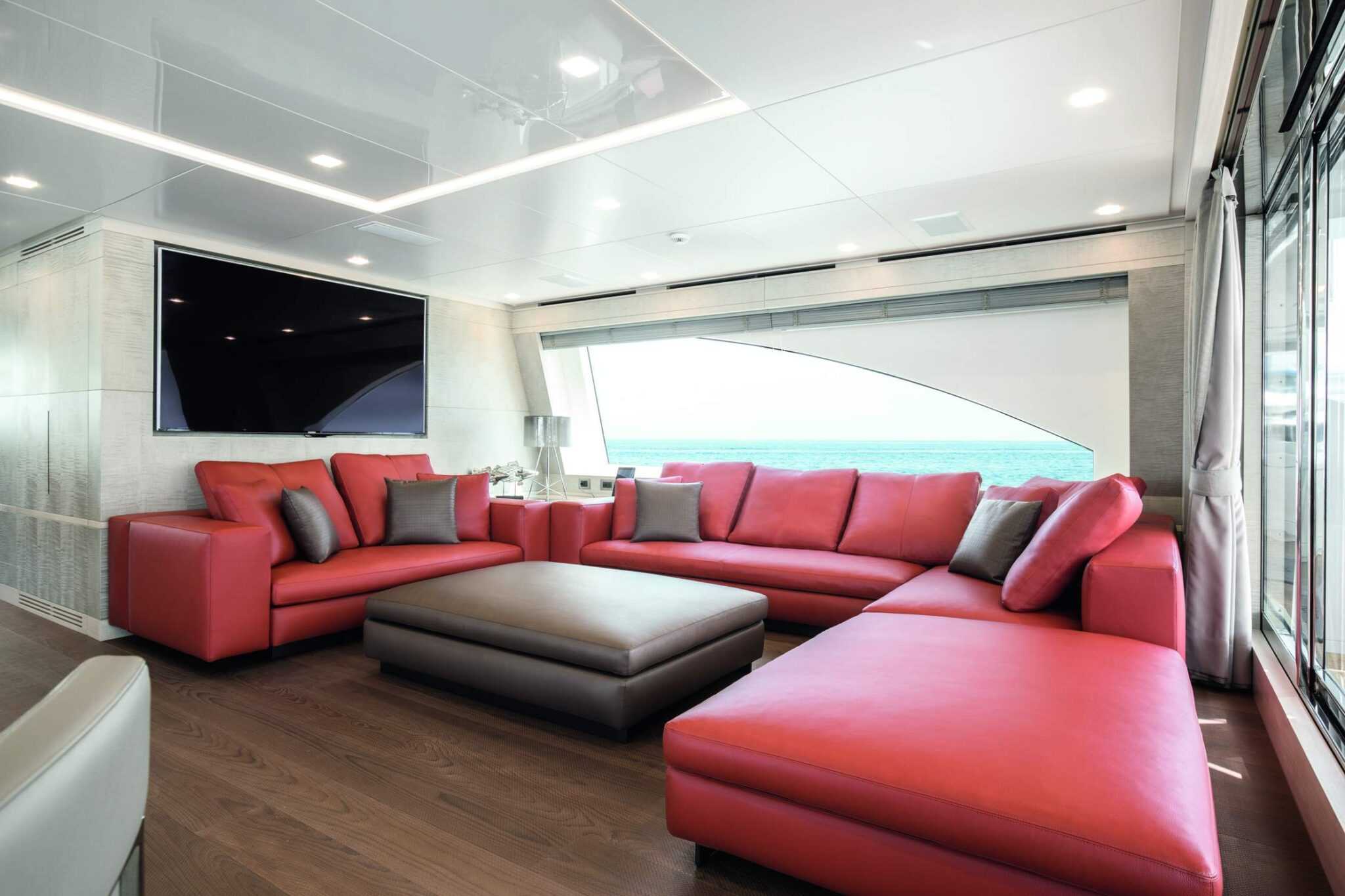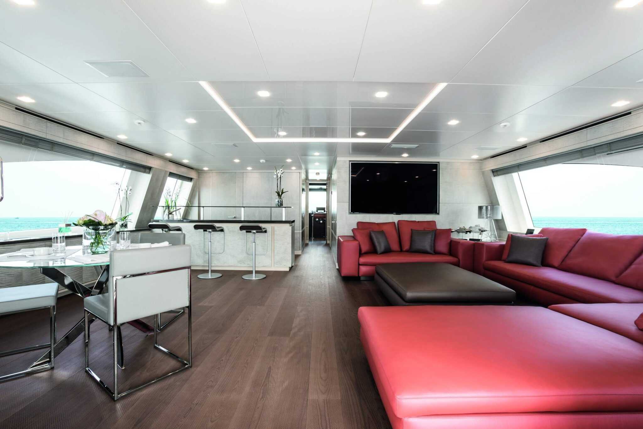 A jacht felső fedélzetén a panorámajakuzzi és az azt L alakban körbevevő napozóágy mellett egy kisebb tánctér is elfér. A hajó orra felé nézve pedig egy leárnyékolt szabadtéri nappalit alakítottak ki óriási kanapékkal U és L alakban, illetve állítható napozófotelekkel és bárpulttal.