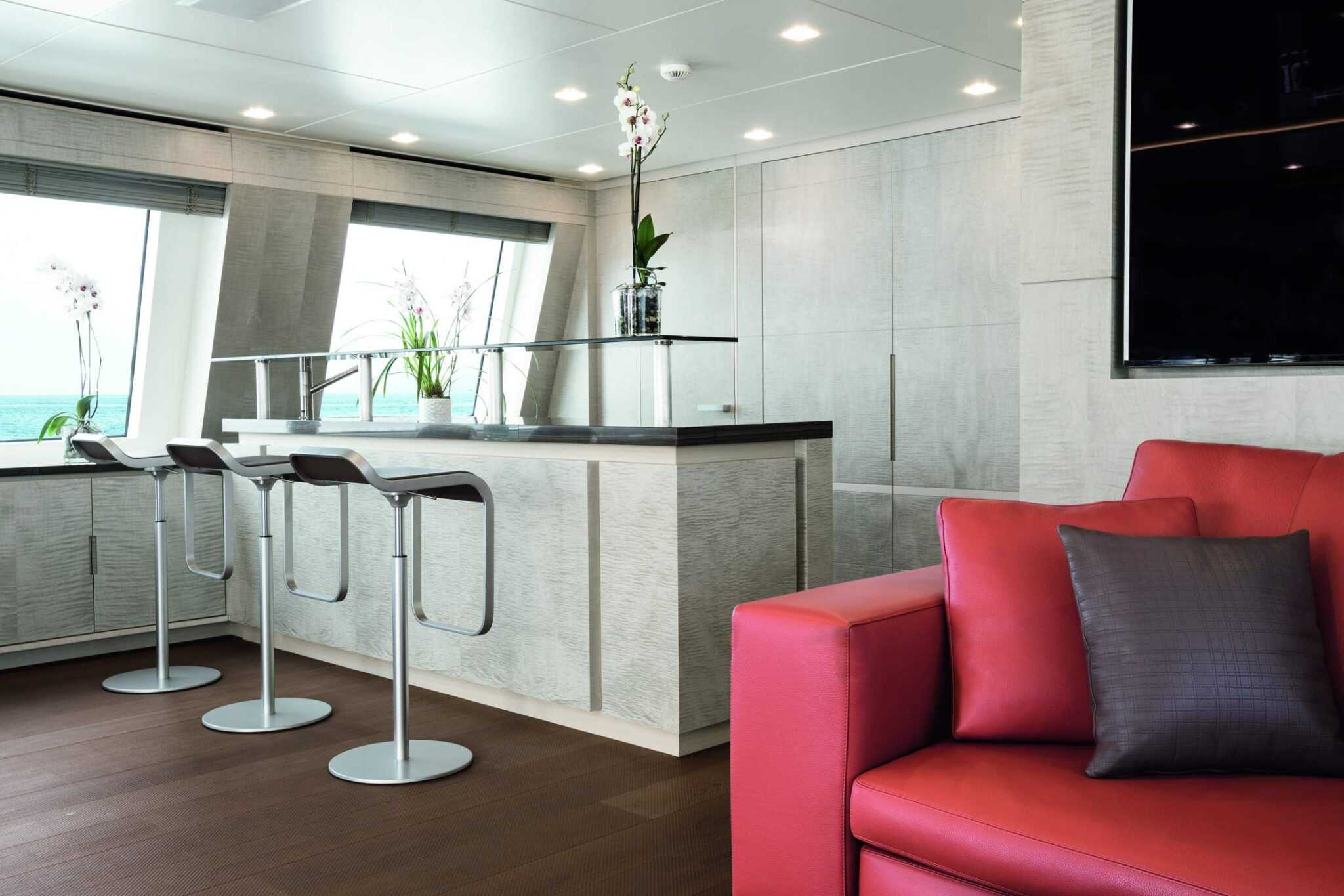 A hajó tulajdonosának lakosztálya a főfedélzet alatti szint nagy részét elfoglalja saját nappalival, bel- és kültéri étkezővel, széles terasszal és hálókabinnal. A vendégek részére lejjebb kialakított négy lakosztály hasonló stílusú, tágas, beépített tárolóban bővelkedik, és természetesen mindegyiknek van saját fürdőszobája.
