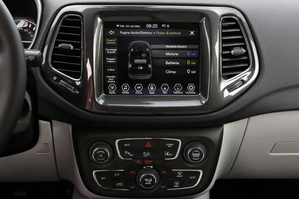A fedélzeten egy 7 colos, színes TFT-kijelzőt találunk. A vezető az elektromos, a belső égésű és a hibrid üzemmódban leolvashatja róla az akkumulátor töltöttségi szintjét, a hatótávolságot, a teljesítményleadás százalékos értékét, valamint a töltési szintet. A 8,4 colos színes UConnect képernyőn ugyanakkor olyan új füleket találunk, mint az energiaáramlás, a korábbi utak összesítése, a töltési idők, az E-Save funkció, illetve a különböző töltési beállítások.