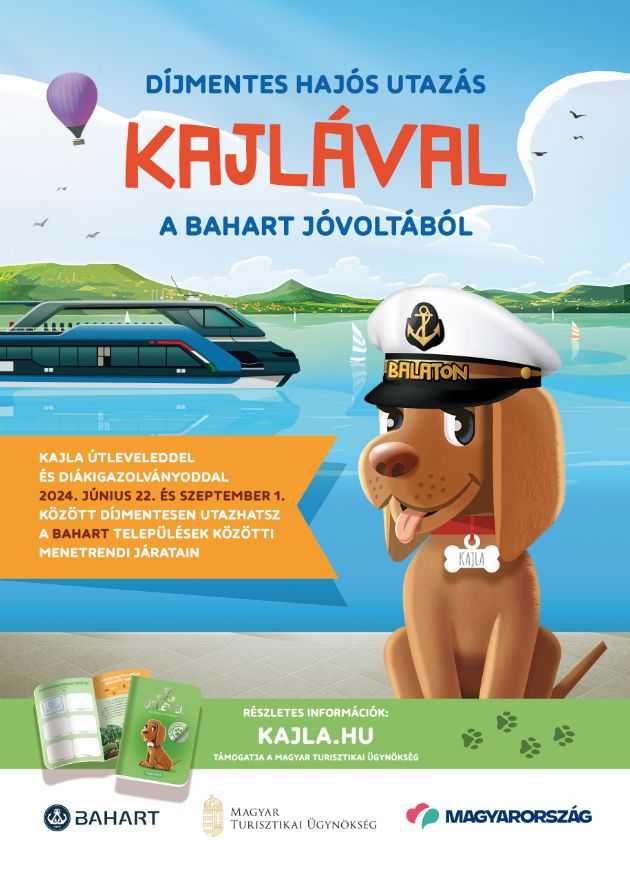 “Vidd magaddal Kajla útleveledet kirándulásaidra, utazásaidra, és mindig vigyázz rá! Azért is fontos, hogy magadnál tartsd, mert saját, világoszöld Kajla útleveleddel és diákigazolványoddal 2024. június 22. és szeptember 1. között díjmentesen hajózhatsz a BAHART települések közötti járatain. Ismerd meg a Balaton-parti települések látnivalóit, utazz díjmentesen hajóval!