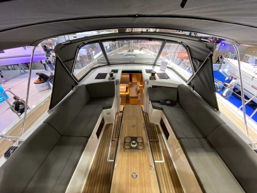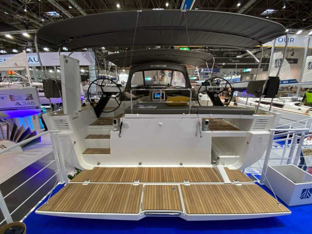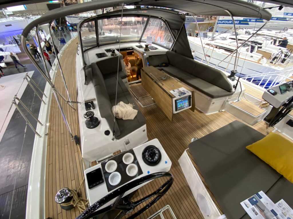 Az oldalsó „törésvonal” meghosszabbítása fokozza a vitorlásteljesítményt és a fedélzet nyújtotta kényelmet. A kokpit akkora lett, hogy a két kormányállás között elfér egy opcionálisan rendelhető napozóágy. Mindezzel együtt annyira széles a tat, hogy két feljáró is elfér rajta, a már Dufour-védjeggyé vált külső konyha és grillpult két oldalán. Erre a részre kérhető az összecsukható dingidaru is. Tágas, könnyen hozzáférhető rekeszbe kerültek az alapvető biztonsági felszerelések és a mentősziget.