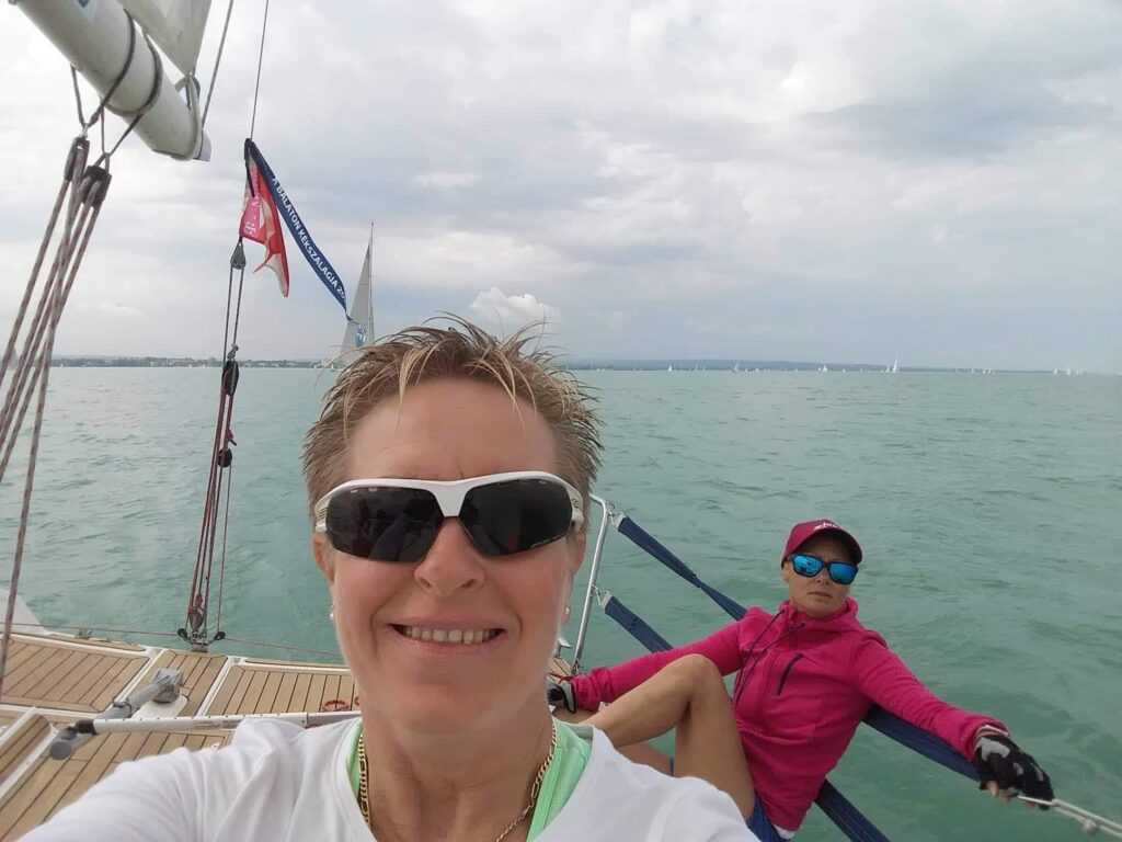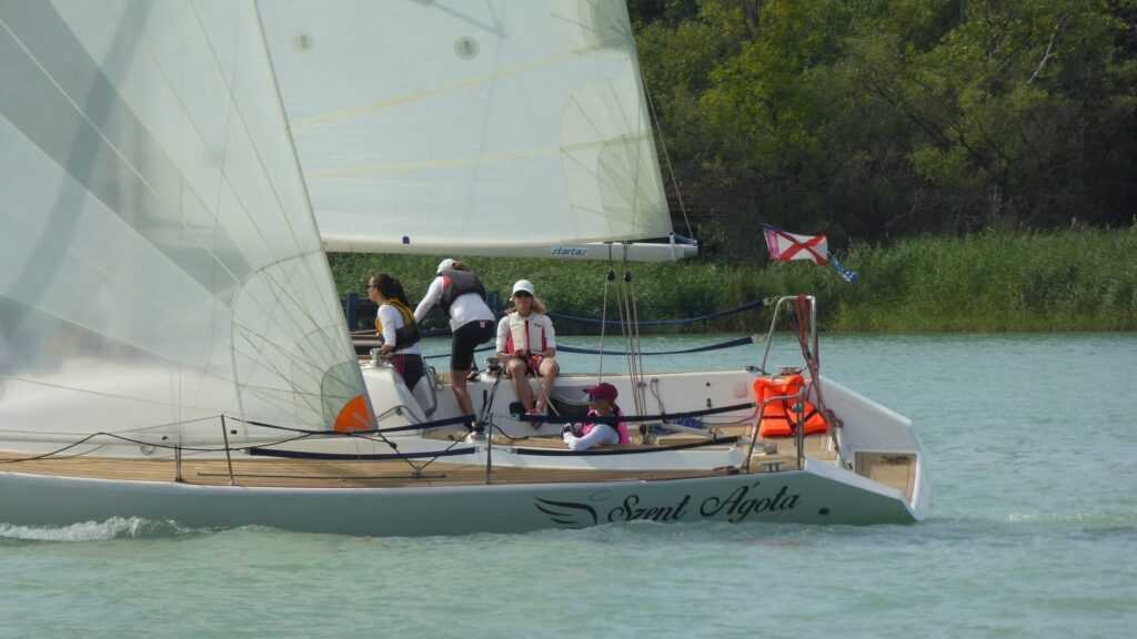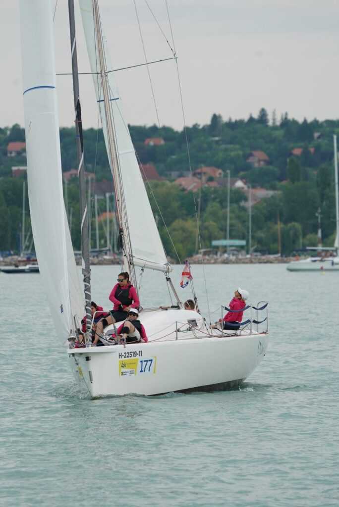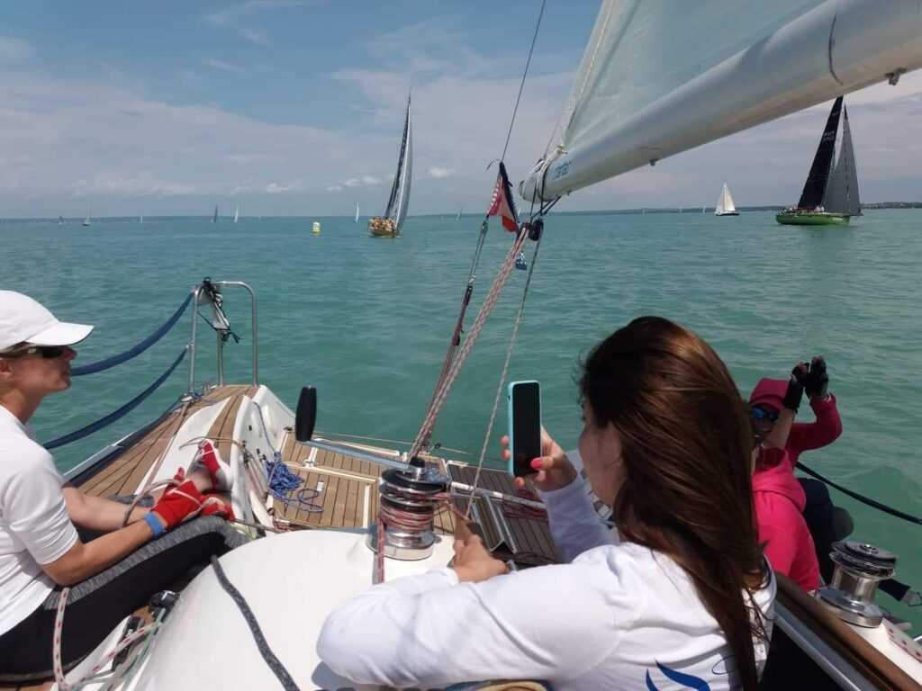 Tihany után ismét a déli part felé vesszük az irányt, tartva a terveinket. Hamarosan a GPS-en és a valóságban is felismerjük hajóosztálybeli üldözőinket, a Fanaticot és a Carpe Diemet. Ők más irányt vesznek a cső után. Még mindig génuával haladunk, a szél fogyogat. A csapat, a hangulat szuper, a lányok kitartóan látják el a feladataikat, még ha az éppen csak annyi, hogy a jó oldalon kucorognak.