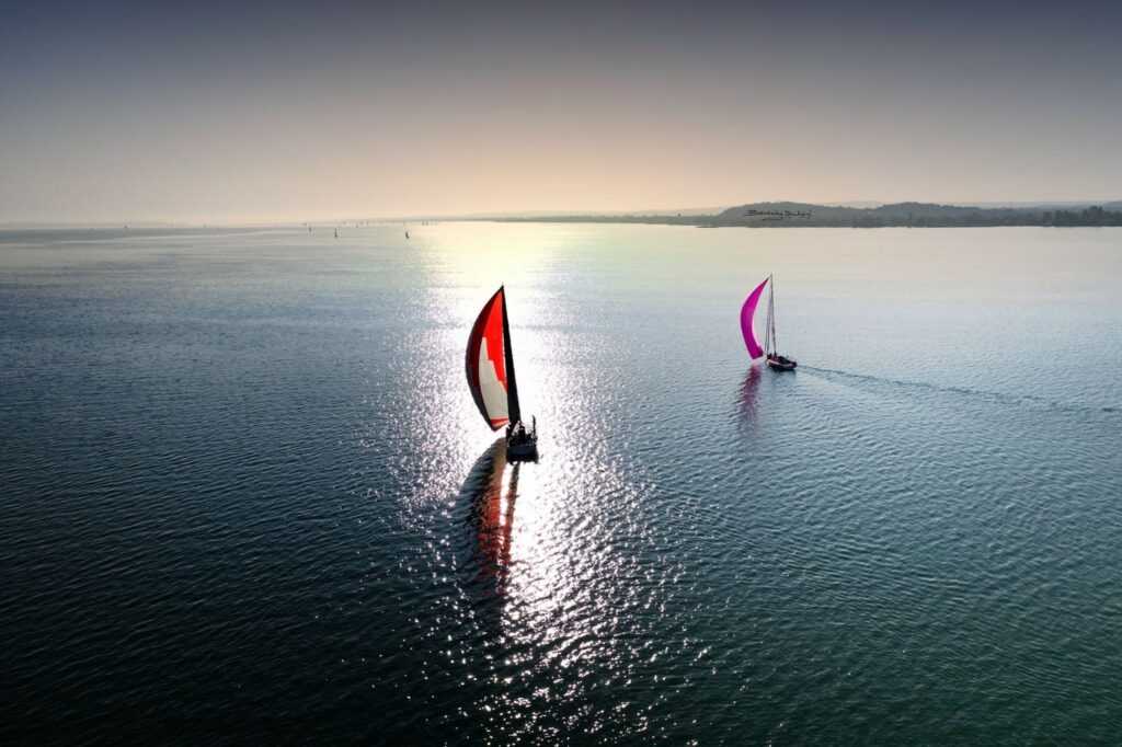 Kicsit csalogat az északi part, de nem engedjük magunkat, mindig vissza-visszaigazítunk a déli felé. Feltűnik egy felhőtömeg Badacsony felett, de nem lesz abból semmi. Keszthelyig még mindig jól tartjuk magunkat. Annak ellenére, hogy vízközépen elég jól haladunk, kiigazítunk délre, félve a tóközépen ragadástól. Helyes döntés, mert naplemente után ismét a déli parton van szél, nincs megállás. Kezd lemenni a nap is, érezzük, hosszú lesz még az éjszaka. Szépen sorban a csapat tagjai átöltöznek az éjszakai menetre, körletrend, hogy ne a sötétben keresgéljük a dolgokat. Megnézzük a naplementét, gyönyörű, mint mindig a vízről. Igyekszünk Keszthelyre, ami még mindig messzinek tűnik. Ellenfelek közül az Oxygent elengedtük, előttünk vannak sokkal, szintén déli oldalon. A Fanatic mögöttünk az északi parton, viszont a Carpe Diem kezd feljönni. Szigligetnél egy csodálatos erősödés, öröm és boldogság, ismét rohanunk.