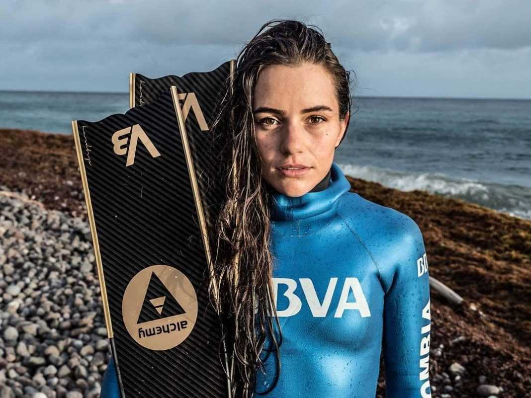 A sportkarrierjét szinkronúszóként kezdő 26 éves, háromszoros pánamerikai és kétszeres világcsúcstartó Sofia egy kővel a karjaiban fut 20 méter mélyen Dominika partjai előtt.