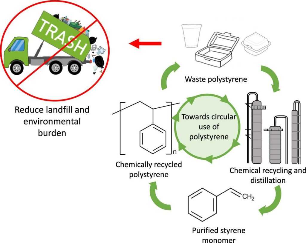 Jelenleg a polisztirol 95 százaléka a hulladéklerakókban végzi, és ugyan létezik néhány módszer az újrahasznosítására, de az ismétlődő ciklusok során az anyag szilárdsága csökken. Az új technika a pirolízist desztillációval kombinálja, így szinte új polisztirolt állítanak elő. Az eljárás során más, kőolajszerű melléktermékek is keletkeznek, amelyek szintén újra felhasználhatók. A folyamat meglehetősen hatékony: 1 kg új anyag előállítása körülbelül 0,4 kWh energiát fogyaszt és 1,67 kg hulladék polisztirolt igényel. A hulladéklerakók használatának kiküszöbölése azt is jelenti, hogy csökken a régi polisztirol környezetbe történő kimosódásának kockázata.