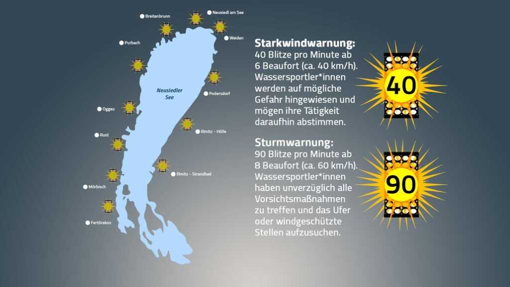 A viharjelző pontok villogó sárga fényjelzéssel jelzik, ha erős szélre, viharra kell számítani, és a szél erősségétől függ, hogy milyen viharjelzést ad a rendszer. Ha nincs viharjelzés, nem működnek a lámpák. Elsőfokú viharjelzés esetén percenként 45 felvillanás jelzi a veszélyt. Ilyenkor csak a parttól számított 500 méteren belül szabad a vízben tartózkodni. Másodfokú esetén a lámpák percenként 90-szer villannak fel. Ilyenkor tilos a vízben tartózkodni.