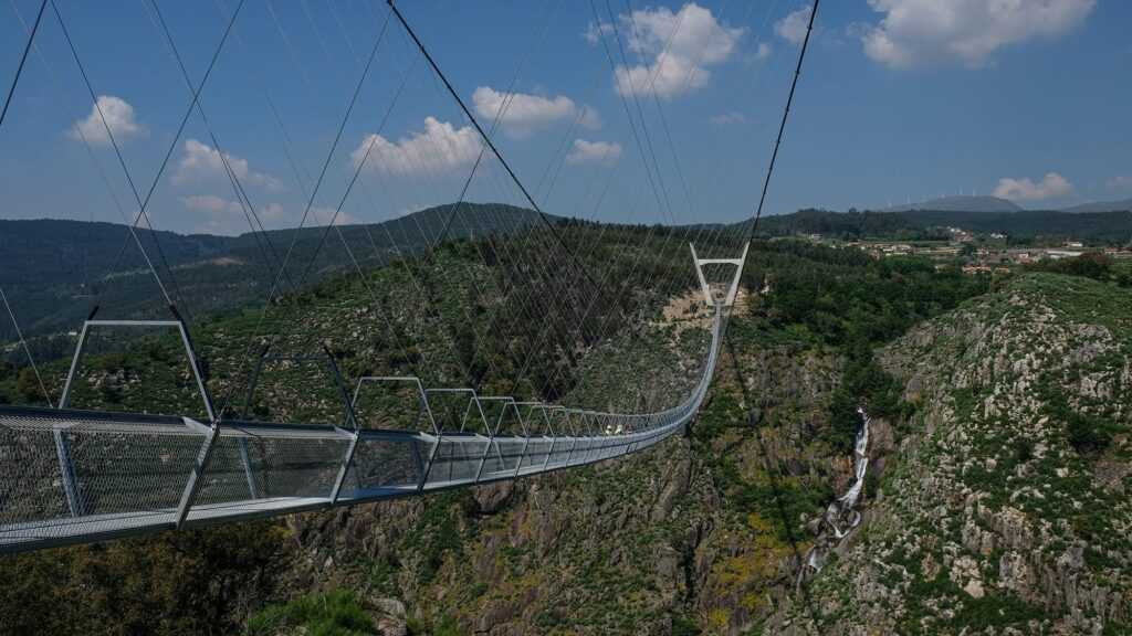 Átadták a világ leghosszabb gyalogos függőhídját Portugáliában. Az első kalandvágyó vendégek múlt héten tehették próbára bátorságukat a szerkezeten.