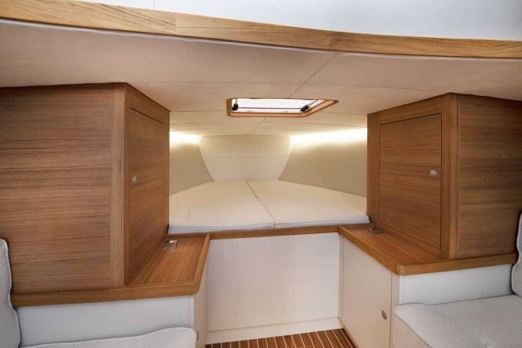 A fedélzet felületéhez újrahasznosítható és fenntartható, megújuló, oldószermentes gyantából készült EcoDeck anyagot használnak, miközben a síkbe süllyesztett fedélzeti nyílások tovább javítják a hajó megjelenését. „Odabent” elegendő a tér (és a fekvőhely) néhány napos túrákhoz: dupla fekhely az orrkabinban, két 2 méter hosszú kanapé a szalonban, jól felszerelt konyha, WC- és zuhanyfülke, valamint egy nagy méretű hátsó hálóhely.