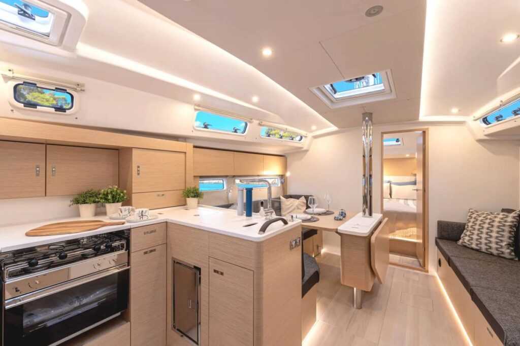 Lent nagy konyha a bal oldalra került, a kétkabinos változatban van kamra hűtővel, külön zuhanyos nagy fürdő jobb, és C alakú ülések a bal oldalon. Kérhető pluszfürdő az orrkabinba, akkor jobbra helyezik át a franciaágyat, hogy mindennek jusson elég hely. Hátul pedig lehet egy vagy két kabin. Kulcselem a kokpit, a lehajtható kormányosi ülések közötti harmadik szék alatt grillező bújik meg.