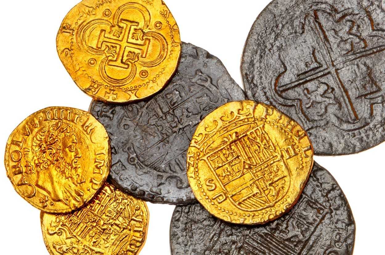 Coins of the Spanish Armada (replicas) 8 Reales, Phillip II (largest, behind) 2 Escudos, Phillip II (cross, top left) 1 Escudo, Charles I (bottom left), Image: 258943654, License: Rights-managed, Restrictions: , Model Release: no, Credit line: Profimedia, Alamy