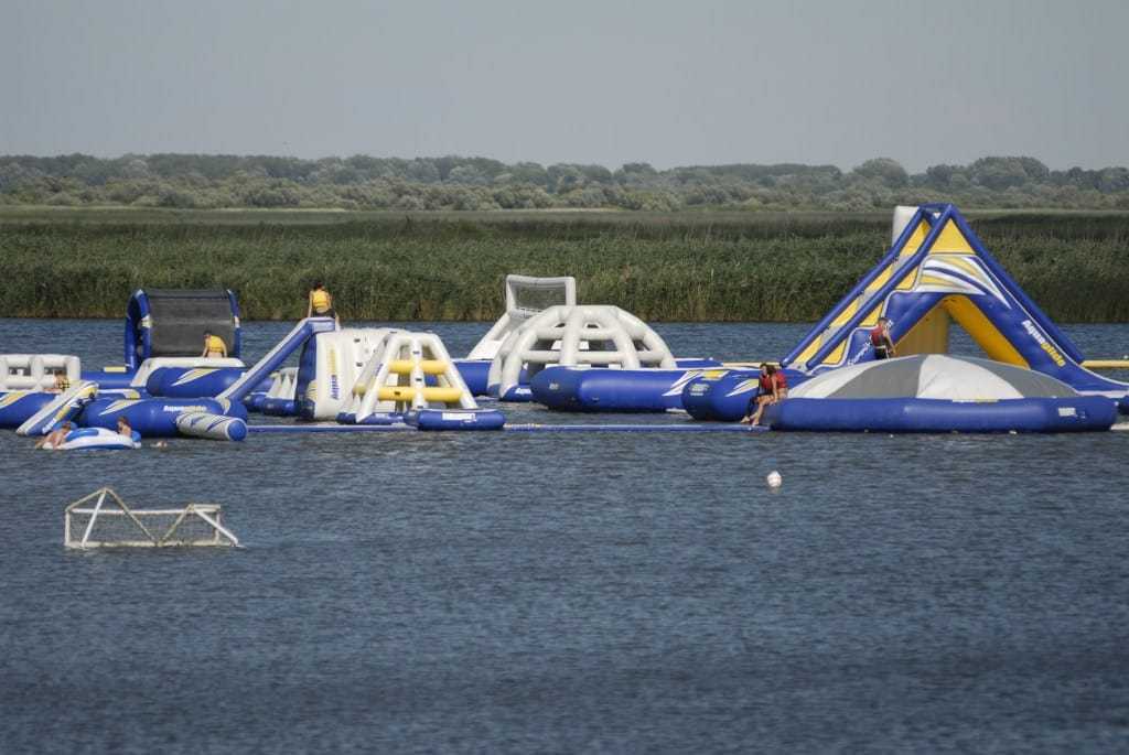 A homokos strand egyik leglátványosabb része az 580 négyzetméter felületű sulyomtávoltartó stégrendszer, míg a másik a felfújható vízi játszótér. A stégrendszeren a vízből való be- és kijutást fürdőlétrák teszik lehetővé, illetve több napozóteraszt és napvitorlákat is kihelyeztek. Az elemeiből két kis szigetet, valamint egy vízilabdapályát is kialakítottak. Újdonság még, hogy az egyik szigetről a másikra kötélpályás tutajon lehet átjutni.