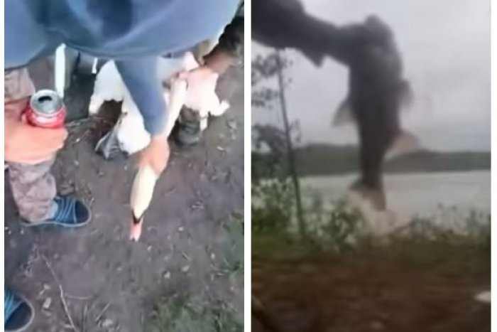 A videó másik részében az egyik horgász a kezében fogja a halat, majd egy sportriporter stílusában közvetíti, ahogy berúgja a vízbe.