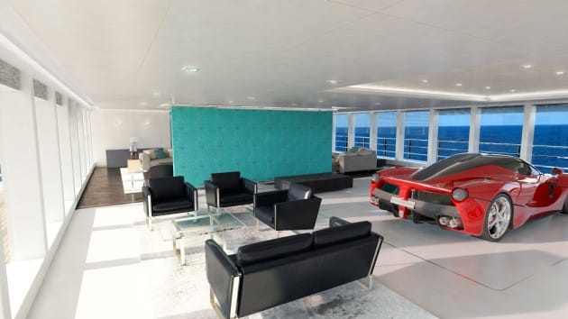 Ebben a részben tengeri repülő, autó, motorkerékpár, vitorlás, jet-sky, hőlégballon, légpárnás csónak is elfér. Az enteriőr egyébként is lenyűgöző, a két hálószoba 360 fokos kilátást kínál csak úgy, mint a napozóterasz. Az első tér a közösségi rész, ahol a járművek mellett egy iroda kap helyet. A tulajdonos hálószobája a jacht hátsó részében található. És persze jut hely a mentőcsónaknak, de még egy kültéri mozinak is.