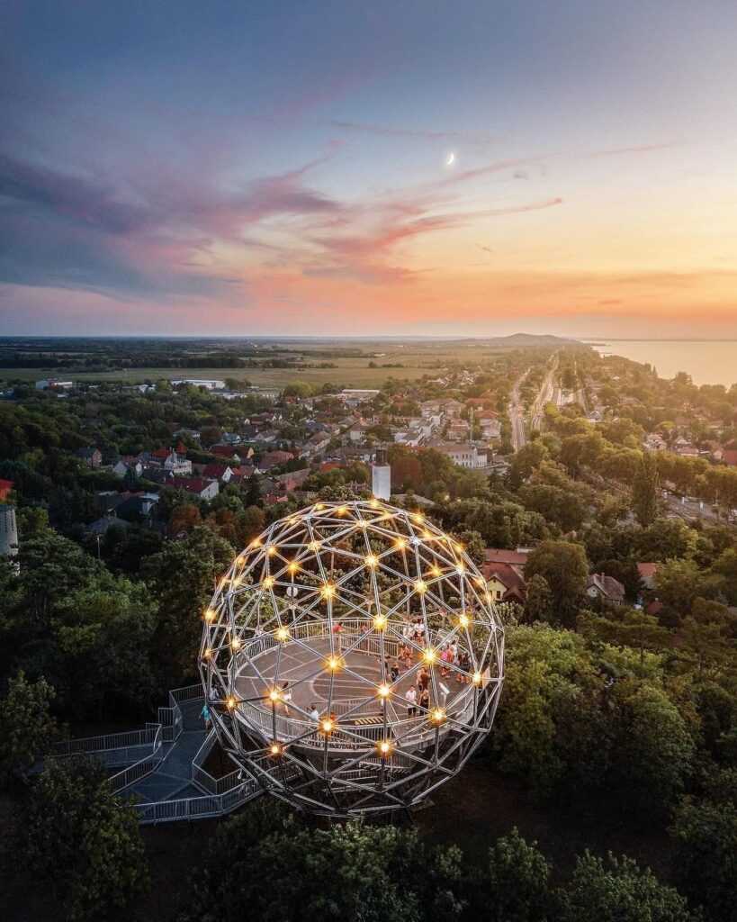 A kilátó 1967-ben került mai helyére, a vulkanikus eredetű Várdomb csúcsára. Éjszaka díszkivilágításban pompázik, így az északi partról is könnyen felfedezhető. Érdekessége, hogy erős szélben jelentősen kilenghet, de rugalmas szerkezetének köszönhetően sikeresen dacol a terheléssel. A nagy méretű kilátóteraszról káprázatos panoráma nyílik a Balatonra és annak északi partjára – írta a turistamagazin.hu.