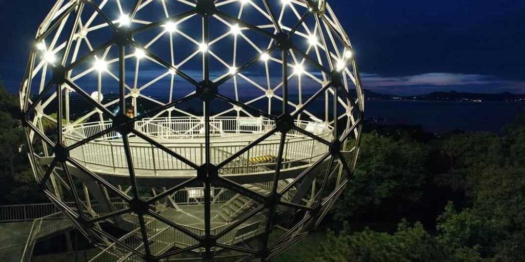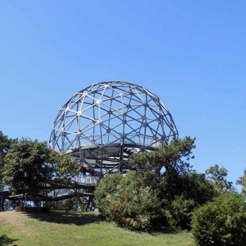 A fásítást megelőzően Kopasz-dombnak nevezett Várdombon 165 m-es tengerszint feletti magasságban található – 15 méter átmérőjű, 240 háromszög alkotta, alumínium vázszerkezetre épülő – objektumot az 1958-as brüsszeli világkiállítás szimbóluma, a kilenc hatalmas gömbből álló, 102 méter magas Atomium kolosszusa ihlette.
