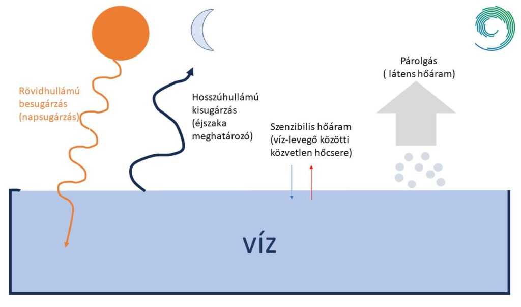 Ezzel szemben éjszaka a lehűlés egyik motorja a hosszúhullámú kisugárzás, ami viszont csak közvetlenül a víz felszínéről történik, így a mélyebb vízrétegekből nem jut ki sugárzási energia. Sugárzási szempontból tehát a Balaton egyfajta üvegházként működik, szemben azzal a vékonyabb talajfelszínnel, amely nappal gyorsan felmelegszik, éjszaka pedig gyorsan le is hűl. Mivel az energia egyensúlynak hosszabb távon a víznél is fenn kell maradnia, ezért kisebb részben a vízfelszín és a levegő közvetlen érintkezése során adódik vissza valamennyi hő a légkörnek, nagyobb részben pedig a víz párolgásával. A vízfelszín párolgása során a víztömeg egy része nagyobb energia állapotú vízgőzzé alakul át elhagyva a vízfelszínt, ezáltal s párolgás tömeghez kötötten energiát visz ki a vízből. Ezt az energiát a párolgási hővel számszerűsítik a fizikában. A párolgás viszont függ a hőmérséklettől, ami február közepén éjszakánként nagyon alacsony volt, így a párolgással járó hőleadás is csekélyebb volt.