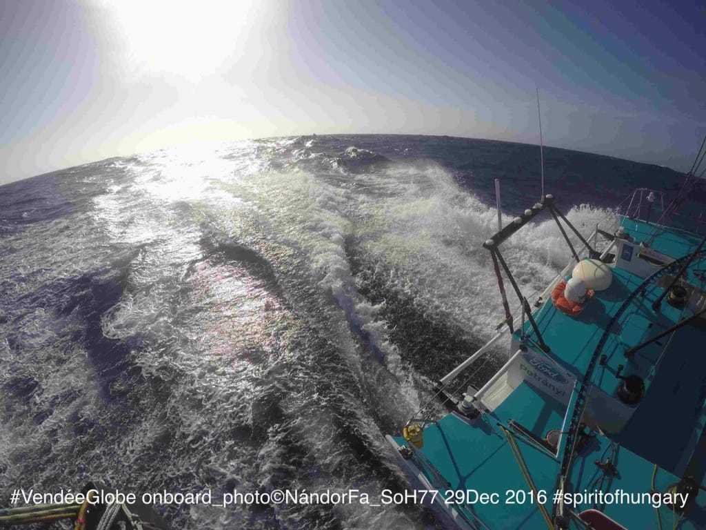 Fa Nándor szerint az árbóc még úgy, ahogy rendben van, de azt sem merné kitenni túl nagy terhelésnek. A magyar hajós maradt a tőle északra hétfő délelőtt átrohanó viharzóna déli szélén, és nem próbált meg minden kihozni a hajóból a nagyobb sebesség reményében. Számításai szerint a legnagyobb szél, amit ezzel a taktikával a Spirit of Hungarynek ki kell bírnia a célig 45 csomó (több mint 80 km/h) lesz.