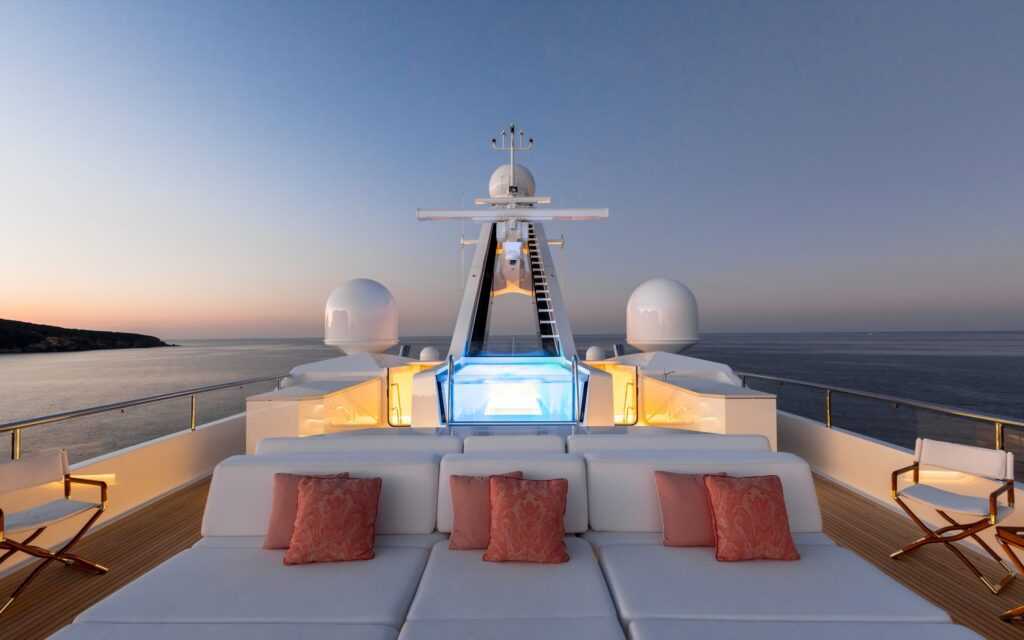 A 230 láb hosszú Feadship ritka jelensége a charterpiacnak. Az öt fedélzetet magában foglaló jacht tágas szabadtéri tere páratlan, így akár a lehető legjobb kilátást nyújtó jógaórára is lehetőséget biztosít. A wellnessdedikált létesítmények az alsó fedélzeten találhatók. A képzett fedélzeti masszőrrel, kozmetikussal és szomatológussal is büszkélkedő spában a kezelések menüje személyre szabott élményt nyújt a vendégeknek, a Pinks Boutique arckezeléstől a hétféle masszázson át a szempillák meghosszabbításáig. A fitneszrajongók számára ideális, teljesen felszerelt, extra nagy edzőterem közel 360 fokos kilátást nyújt a vízre, míg a gőzzuhany gyorsan elmossa a fájdalmakat.