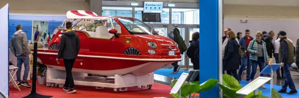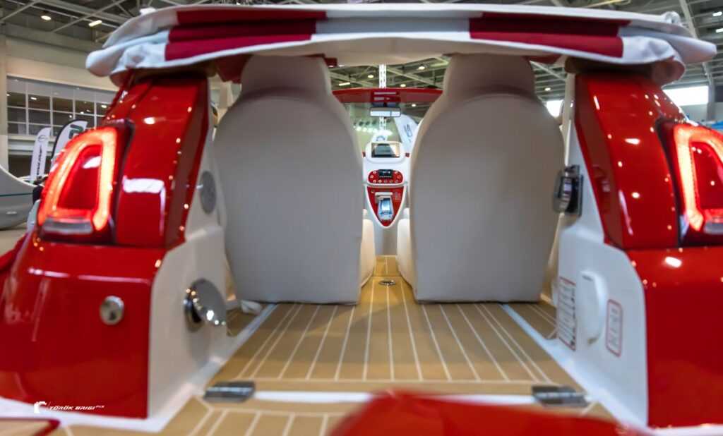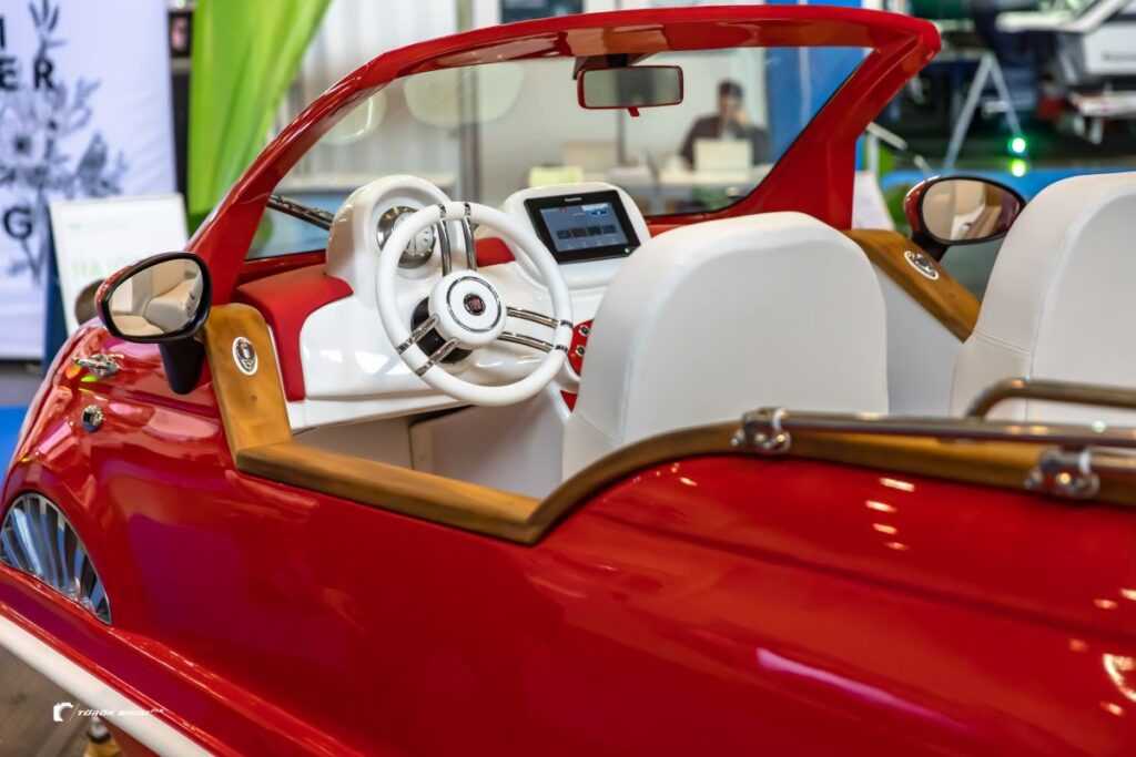 A Hungexpo G pavilonjában egy tűzpiros Fiat 500-as késztetett azonnali megállásra mindenkit, aki belépett a csarnokba. És nem pusztán a színe miatt, hanem mert hamar kiderült, hogy az „autó” valójában egy motorcsónak.