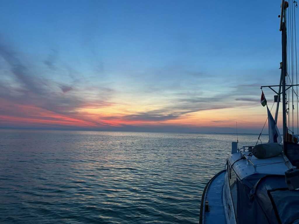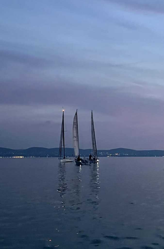 A rajtnál egész kellemes körülményeket kaptunk, mindenki luvrajtot akart jobbcsapáson, én kicsit késleltettem, hogy a legfelső hajó legyek, plusz óvtam a „családi örökséget”. A jutalmam az lett, hogy talán én tudtam legtovább húzni a jobbcsapást az északi part felé. Kezdett foltossá válni a szél, az eleje el-elment, a vége le-lemaradt. A jelnél komoly hibát vétettem (persze ez csak utólag látszott): bele akartam menni a friss keleti szélbe, nyitottam a víz felé, pedig maradni kellett volna a part közelében, mert ott tartott ki tovább a szél. Aztán stabilizálódott az északkeleti, halzolgatva haladtam, sötétben értem a honos kikötőm (TYC) elé, és ott komolyan elgondolkodtam, hogy inkább feladom és hazamegyek. De pont jött némi szél, meg kiszámoltam, hogy ha 11 óra volt a keleti medence, akkor 22 lesz a nyugati. Lementem a déli parthoz, bízva abban, hogy ott marad meg tovább szél, aztán „majd jön valami”. Ebből lett a második komoly hiba, mert semmi sem érkezett, viszont aki kitartott vízközépen, az elment. Gyönyörű volt az éjszaka, világított a telihold, hallgattam a rádiót, később jöttek szembe az elsők, szóval nem unatkoztam, élveztem a magányt, hajnalig egész jól bírtam ébren is. Ám sajnos mögöttem kelt föl a nap, és még csak Boglárnál jártam. Megint jött a keleti, a Csuhiig elvitt a lendület, ott a mezőny magja érkezett meg Keszthely felől. Hátszélben mentem be az öbölbe, aztán kreuzban jöttem ki, mindezt teljesen egyedül, és talán egy óra alatt. Kiérve szembetaláltam magam három hajóval (Póstás, Arwen, Nobis), ők akkor indultak befelé.