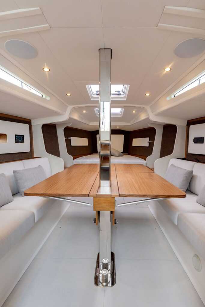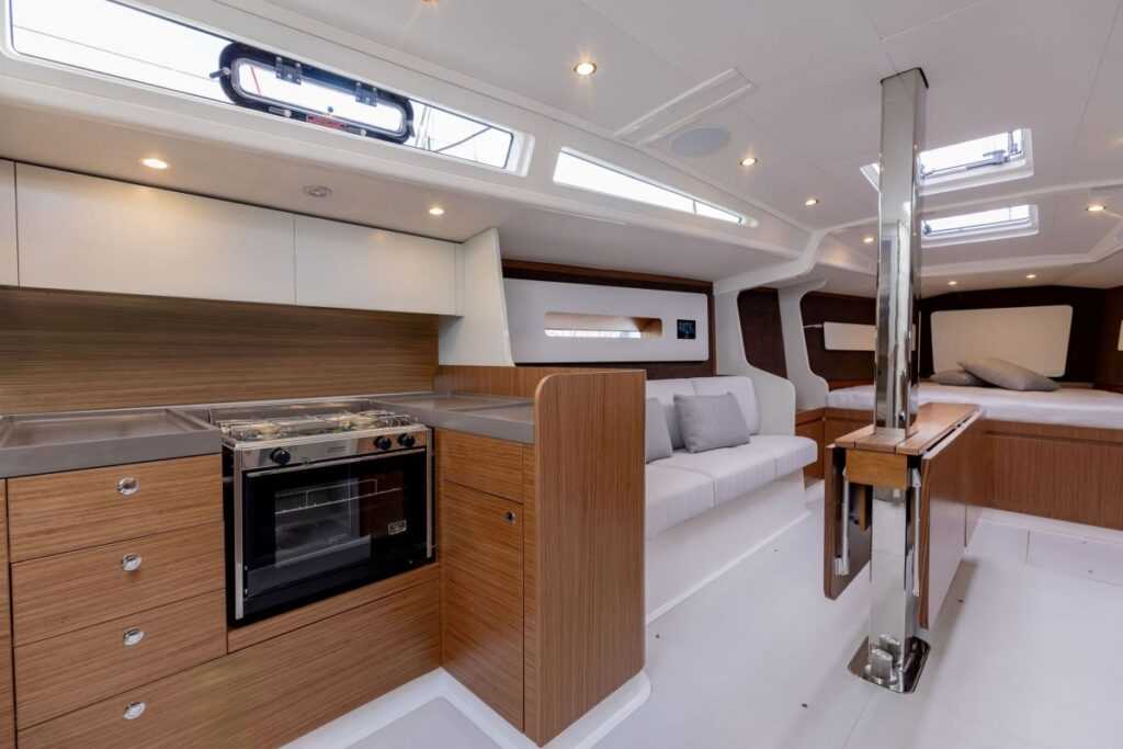Le a szalonba fa lépcsők vezetnek, bent csillogó fehér üvegszálas padló és plafon, valamint rengeteg fából készült szekrény várja az érkezőt. A konyha nem alibi megoldás, billegő sütővel és főzőlappal, közepes méretű, felül nyitható hűtőszekrénnyel és mosogatóval, valamint megfelelő tárolóhelyekkel bír. A három, kétágyas kabinból az orrban lévő nincs leválasztva a szalonról, cserébe sok tetőablakot kapott (de rendelhető kivehető ajtó és keret, hogy ez a rész is kellő intimitással bírjon). Az egy szem fürdő a jobb oldalra került, mérete megegyezik a konyháéval, benne zuhanyzó, mosdó és elektromos WC. Nincs külön térképasztal, a navigációt a chartplotterről lehet intézni.