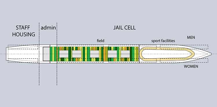A 3300 embernek otthont adó úszó börtönt egy kiszolgált teherhajó átalakításával képzelték el, amelyre nyolc óriási panelt szerelnének. A háromszázötven méter hosszú, száz méter magas, papíralapú, de a terhelésnek és az elemeknek tartósan ellenálló cellarendszer minden eleme kilenc négyzetméteres lenne, helyet pedig Panamaváros partjaihoz közel, a Panama-csatorna déli bejáratánál kaphatna.