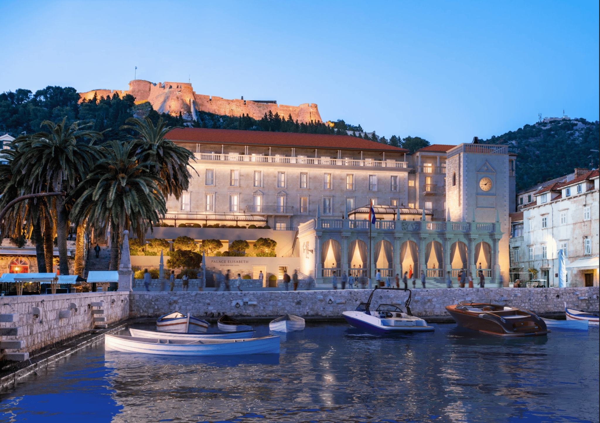 A tér másik oldalán pedig az európai történelem egy újabb becses darabja kel életre. Teljes felújítást követően, a Palace Elisabeth Hvar első 5 csillagos szállodájaként, 45 szobával kínálja luxus színvonalú szolgáltatásait a turistáknak szeptember 1-jétől.